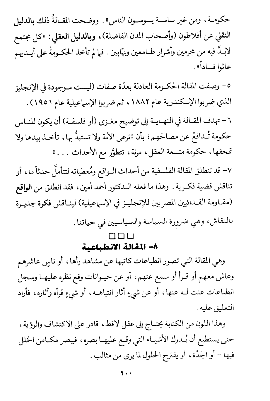 7- قد تنطلق المقالة الفلسفية من أحداث الواقع ومعطياته لتتأمل حدثًا ما، وتناقش قضية فكرية، وهذا ما فعله الدكتور أحمد أمين، فقد انطلق من الواقع "مقاومة الفدائيين المصريين للإنجليز في الإسماعيلية" ليناقش فكرة جديرة بالنقاش، وهي ضرورة السياسة والسياسين في حياتنا.