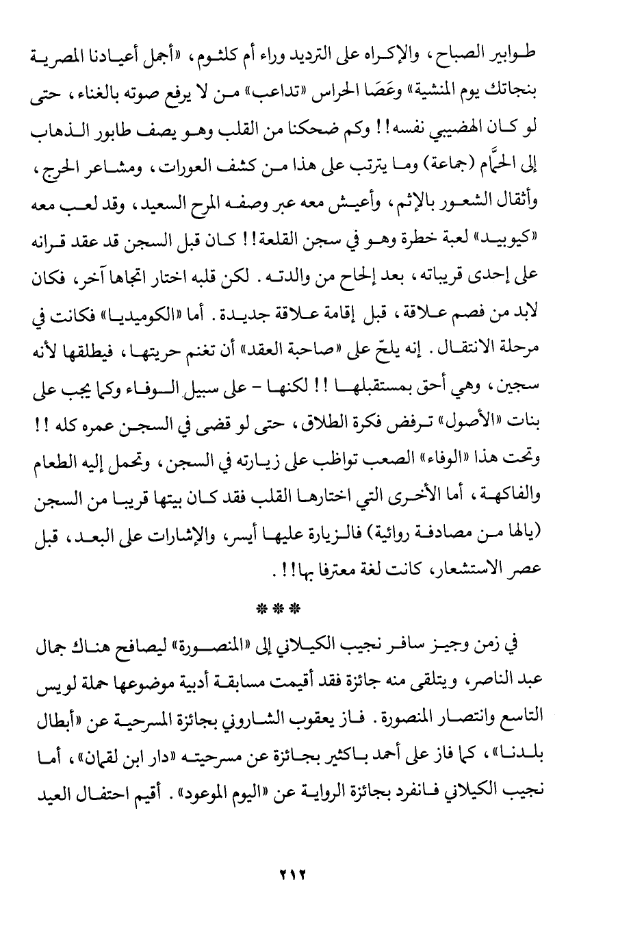 طوابير الصباح، والإكراه على الترديد وراء أم كلثوم "أجمل أعيادنا المصرية بنجاتك يوم المنشية" وعصا الحراس "تداعب" من لا يرفع صوته بالغناء، حتى لوكان الهضيبي نفسه! وكم ضحكنا من القلب وهو يصف طابور الذهاب إلى الحمام "جماعة" وما يترتب على هذا من كشف العورات، ومشاعر الحرج وأثقال الشعور بالإثم، وأعيش معه عبر وصفه المرح السعيد، وقد لعب معه "كيوبيد" لعبة خطرة وهو في سجن القلعة!! كان قبل السجن قد عقد قرانه على إحدى قريباته، بعد إلحاح من والدته. لكن قلبه اختار اتجاهًا آخر، فكان لا بد من فصم علاقة، قبل إقامة علاقة جديدة، أما "الكوميديا" فكانت في مرحلة الانتقال. إنه يلح على "صاحبة العقدة" أن تغنم حريتها، فيطلقها لأنه سجين، وهي أحق بمستقبلها!! لكنها -على سبيل الوفاء وكما يجب على بنات "الأصول"- ترفض فكرة الطلاق، حتى لو قضى في السجن عمره كله!! وتحت هذا الوفاء الصعب تواظب على زيارته في السجن، وتحمل إليه الطعام والفاكهة، أما الأخرى التي اختارها القلب فقد كان بيتها قريبًا من السجن "يا لها من مصادفة روائية" فالزيارة عليها أيسر، والإشارت على البعد، قبل عصر الاستشعار، كان لغة معترفًا بها!!