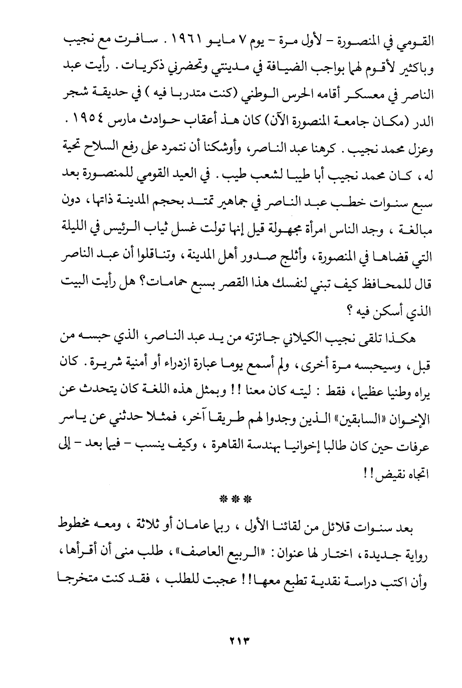 القومي في المنصورة -لأول مرة- يوم 7 مايو 1961. سافرت مع نجيب وباكثير لأقوم لهما بواجب الضيافة في مدينتي وتحضرني ذكريات. رأيت عبد الناصر في معكسر إقامة الحرس الوطني "كنت متدربًا فيه" في حديقة شجر الدر "مكان جامعة المنصورة الآن" كان هذا أعقاب حوادث مارس 1954.