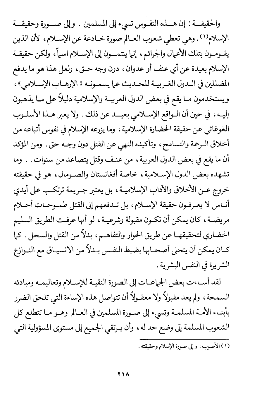 والحقيقة: أن هذه النفوس تسيء إلى المسلمين وإلى صورة وحقيقة الإسلام1. وهي تعطي شعوب العالم صورة خادعة عن الإسلام، لأن الذين يقومون بتلك الأعمال والجرائم، إنما ينتمون إلى الإسلام اسما، ولكن حقيقة الإسلام بعيدة عن أي عنف أو عدوان، دون وجه حق، ولعل هذا هو ما يدفع المضللين في الدول الغربية للحديث عما يسمونه "الإرهاب الإسلامي" ويستخدمون ما يقع في بعض الدول العربية والإسلامية دليلًا على ما يذهبون إليه، في حين أن الواقع الإسلامي بعيد عن ذلك. ولا يعبر هذا الأسلوب الغوغائي عن حقيقة الحضارة الإسلامية، وما يزرعه الإسلام في نفوس أتباعه من أخلاق الرحمة والتسامح، وتأكيده النهي عن القتل دون وجه حق. ومن المؤكد أن ما يقع في بعض الدول العربية من عنف وقتل يتصاعد من سنوات.. وما تشهده بعض الدول الإسلامية، خاصة أفغانستان والصومال، هو في حقيقته خروج عن الأخلاق والآداب الإسلامية، بل يعتبر جريمة ترتكب على أيدي أناس لا يعرفون حقيقة الإسلام، بل تدفعهم إلى القتل طموحات أحلام مريضة، كان يمكن أن تكون مقبولة وشرعية، لو أنها عرفت الطريق السليم الحضاري لتحقيقها عن طريق الحوار والتفاهم، بدلًا من القتل والسحل. كما كان يمكن أن يتحلى أصحابها بضبط النفس بدلا من الانسياق مع النوازع الشريرة في النفس البشرية.