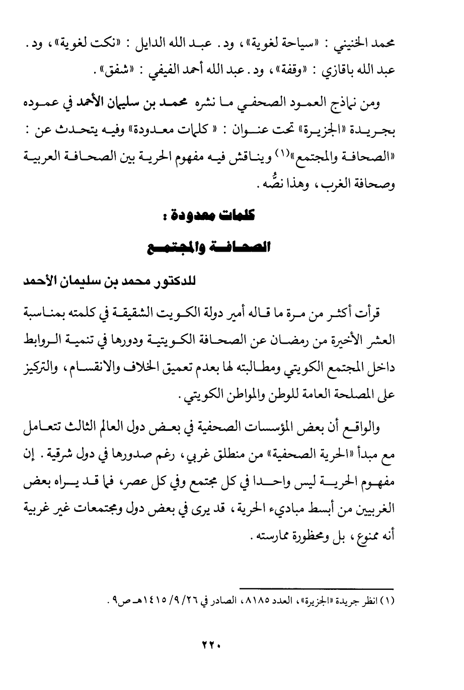 1 انظر جريدة "الجزيرة"، العدد 8185، الصادر في 26/ 9/ 1415 هـ ص9.