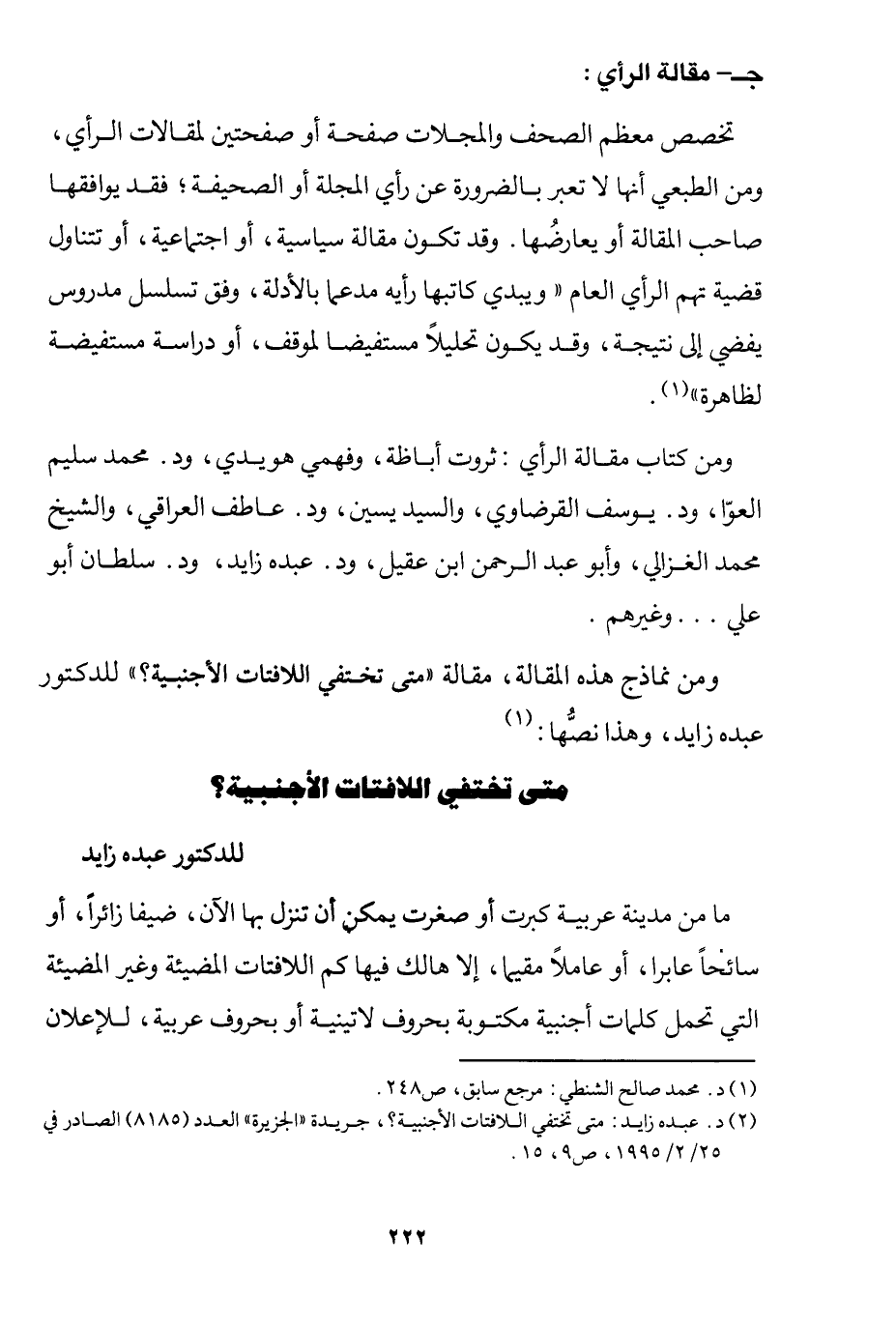 2 د. عبده زايد: متى تختفي اللافتات الأجنبية؟، جريدة "الجزيرة" العدد"8185" الصادر في 25/ 2/ 1995، ص9، 15.