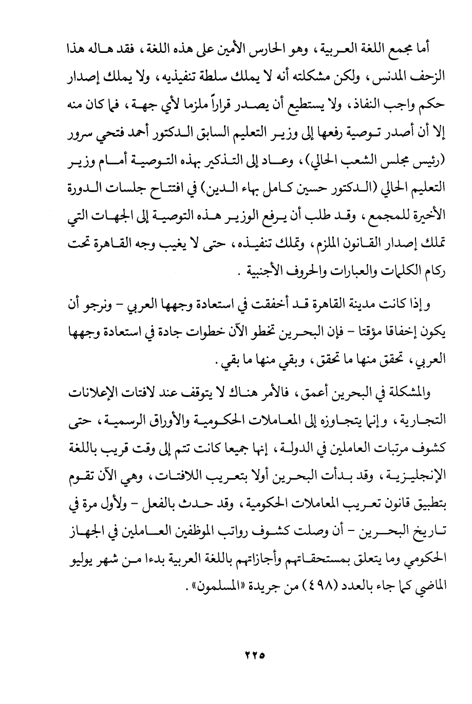 والمشكلة في البحرين أعمق، فالأمر هناك لا يتوقف عند لافتات الإعلانات التجارية، وإنما يتجاوزه إلى المعاملات الحكومية والأوراق الرسمية، حتى كشوف مرتبات العاملين في الدولة، إنها جميعًا كانت تتم إلى وقت قريب باللغة الإنجليزية، وقد بدأت البحرين أولًا بتعريب اللافتات، وهي الآن تقوم بتطبيق قانون تعريب المعاملات الحكومية، وقد حدث بالفعل، ولأول مرة في تاريخ البحرين، أن وصلت كشوف رواتب الموظفين العاملين في الجهاز الحكومي وما يتعلق بمستحقاتهم وأجازاتهم باللغة العربية بدءًا من شهر يوليو الماضي كما جاء بالعدد "498" من جريدة "المسلمون".