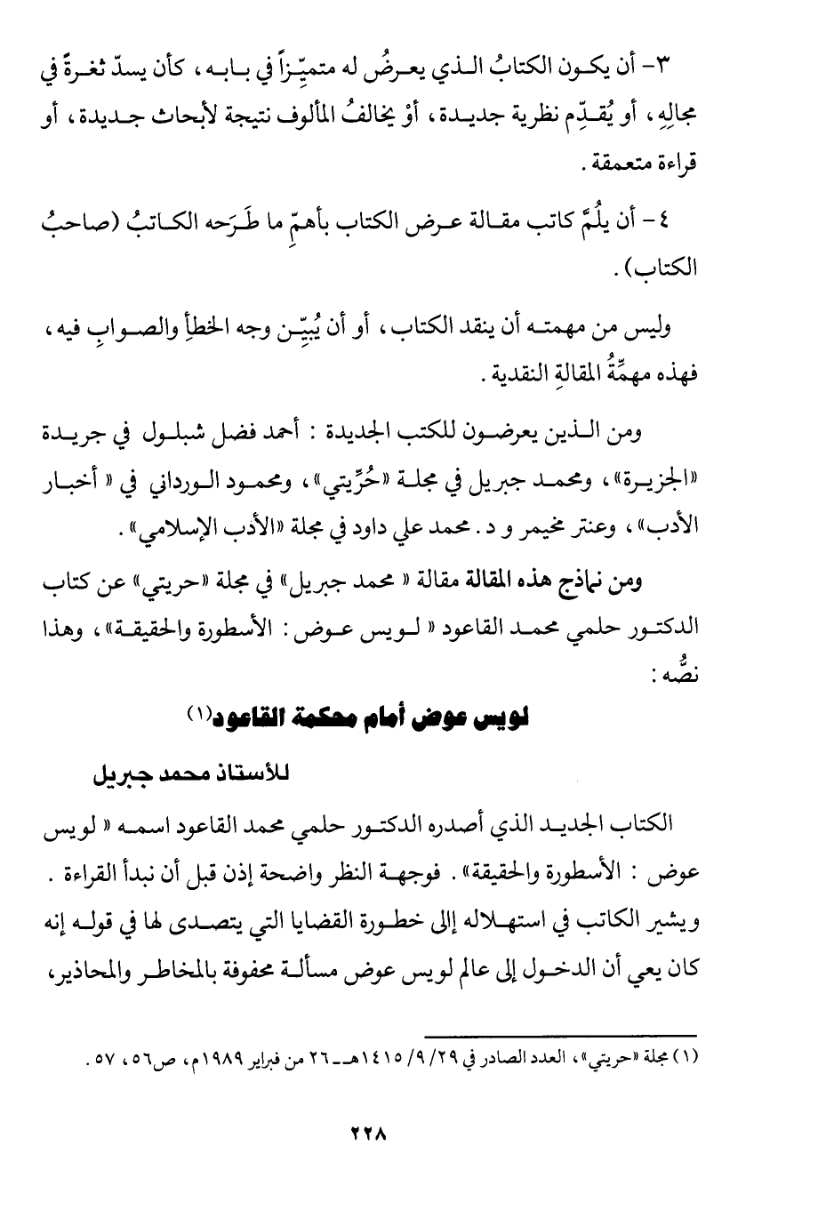 ومن نماذج هذه المقالة مقالة "محمد جبريل" في مجلة "حريتي" عن كتاب الدكتور حلمي محمد القاعود "لويس عوض: الأسطورة والحقيقة"، وهذا نصه: