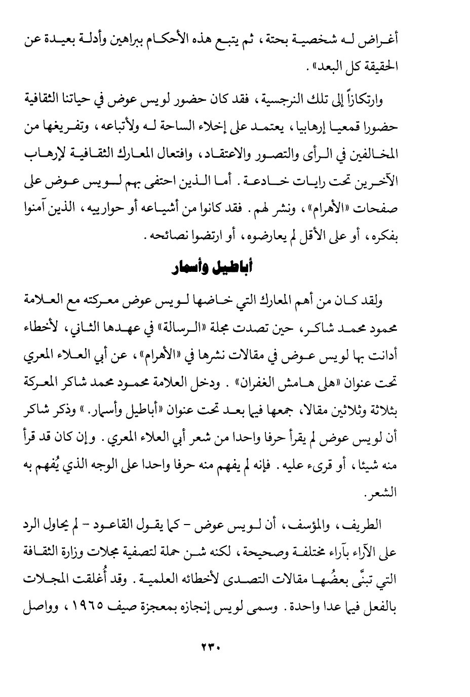 ولقد كان من أهم المعارك التي خاضها لويس عوض معركته مع العلامة محمود محمد شاكر، حين تصدت مجلة "الرسالة" في عهدها الثاني لأخطاء أدانت بها لويس عوض في مقالات نشرها في "الأهرام"، عن أبي العلاء المعري تحت عنوان "على هامش الغفران"، ودخل العلامة محمود محمد شاكر المعركة بثلاثة وثلاثين مقالًا، جمعها فيما بعد تحت عنوان" أباطيل وأسمار" وذكر شاكر أن لويس عوض لم يقرأ حرفًا واحدًا من شعر أبي العلاء المعري. وإن كان قد قرأ منه شيئًا، أو قرئ عليه، فإنه لم يفهم منه حرفًا واحدًا على الوجه الذي يفهم به الشعر.