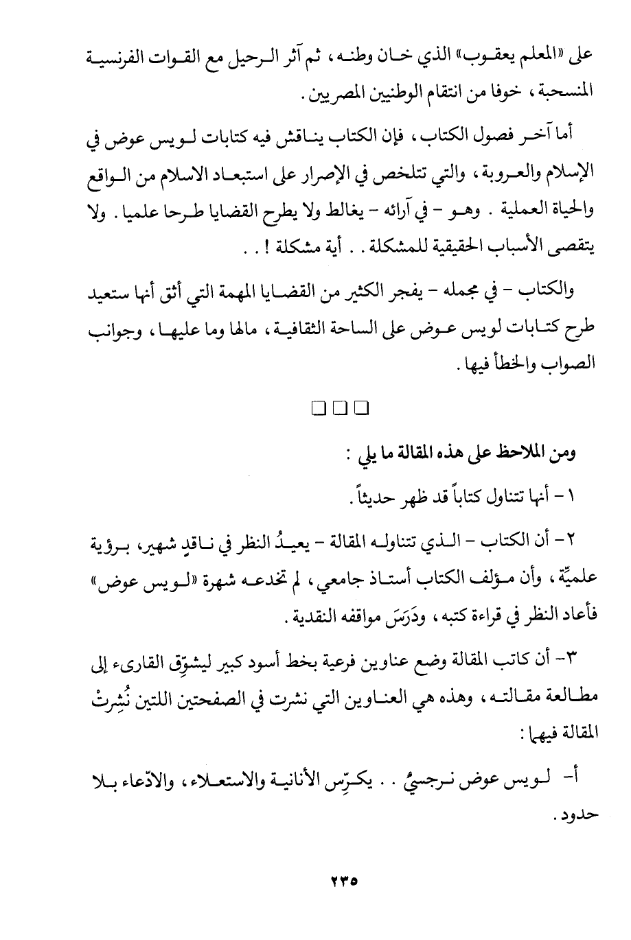 2- أن الكتاب -الذي تتناوله المقالة- يعيد النظر في ناقد شهير، برؤية علمية، وأن مؤلف الكتاب أستاذ جامعي، لم تخدعه شهرة "لويس عوض" فأعاد النظر في قراءة كتبه، ودرس مواقفه النقدية.