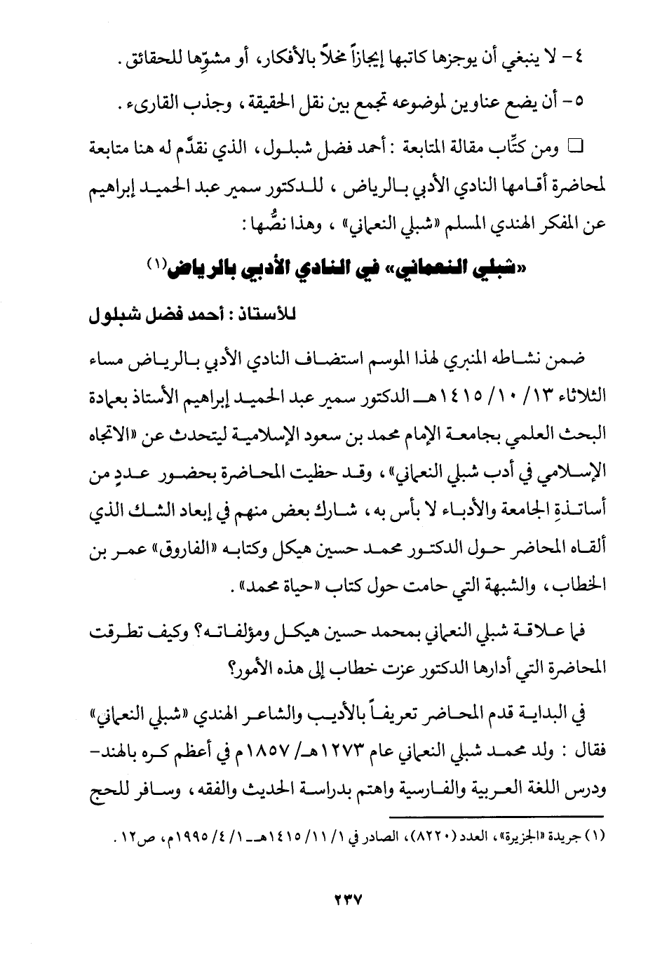 ومن كتاب مقالة المتابعة: أحمد فضل شبلول، الذي نقدم له هنا متابعة لمحاضرة أقامها النادي الأدبي بالرياض، للدكتور سمير عبد الحميد إبراهيم عن المفكر الهندي المسلم"شبلي النعماني"، وهذا نصها.