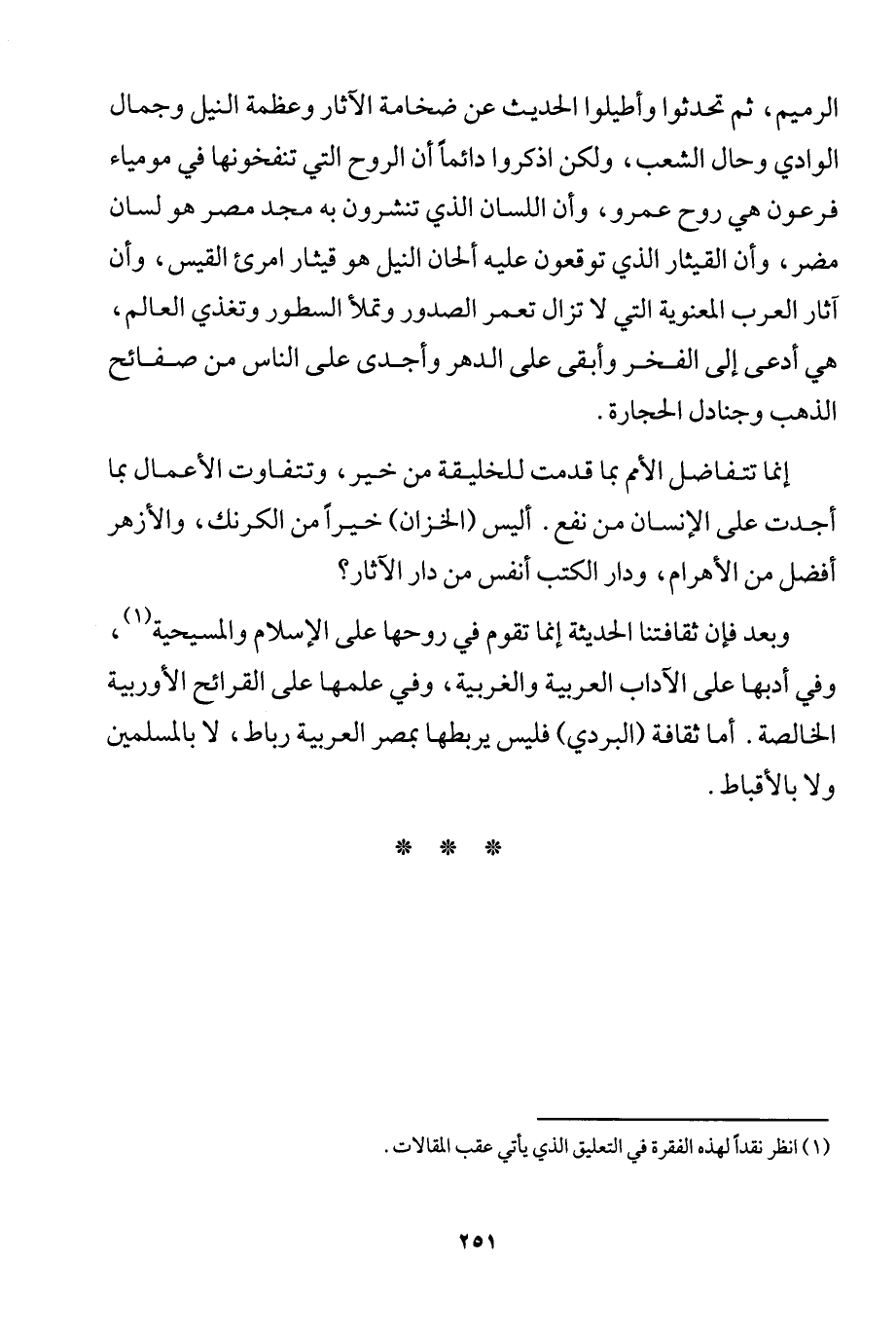 وبعد فإن ثقافتنا الحديثة إنما تقوم في روحها على الإسلام والمسيحية1، وفي أدبها على الآداب العربية والغربية، وفي علمها على القرائح الأوروبية الخالصة. أما ثقافة "البردي" فليس يربطها بمصر العربية رباط، لا بالمسلمين ولا بالأقباط.