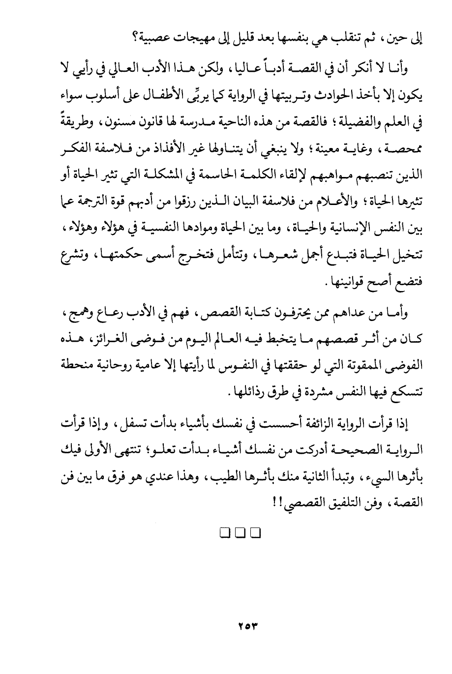 إذا قرأت الرواية الزائفة أحسست في نفسك بأشياء بدأت تسفل، وإذا قرأت الرواية الصحيحة أدركت من نفسك أشياء بدأت تعلو، تنتهي الأولى فيك بأثرها السيئ، وتبدأ الثانية منك بأثرها الطيب، وهذا عندي هو فرق ما بين فن القصة، وفن التلفيق القصصي!!