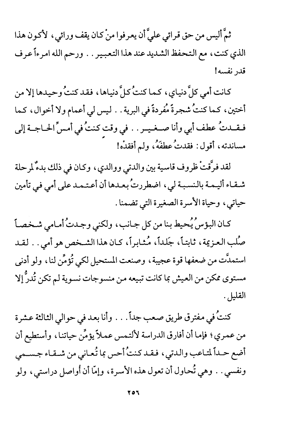 كان البؤس يحيط بنا من كل جانب، ولكني وجدت أمامي شخصًا صلب العزيمة، ثابتًا، جلدًا، مثابرًا، كان هذا الشخص هو أمي.. لقد استمدت من ضعفها قوة عجيبة، وصنعت المستحيل لكي تؤمِّن لنا، ولو أدنى مستوى ممكن من العيش بما كانت تبيعه من منسوجات نسوية لم تكن تُدِرُّ إلا القليل.