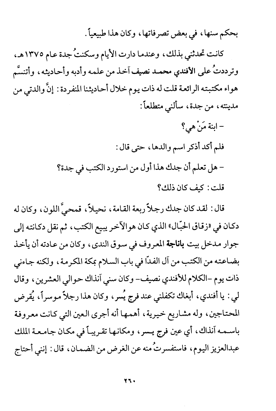 قل: لقد كان جدك رجلًا ربعة القامة، نحيلًا، قمحي اللون، وكان له دكان في "زقاق الحبال" الذي كان هو الآخر يبيع الكتب، ثم نقل دكانته إلى جوار مدخل بيت باناجه المعروف في سوق الندى، وكان من عاداته أن يأخذ بضاعته من الكتب من آل الفدّا في باب السلام بمكة المكرمة، ولكنه جاءني ذات يوم، -الكلام للأفندي نصيف- وكان سني آنذاك حوالي العشرين، وقال لي: يا أفندي، أبغاك تكلفني عند فرج يُسر، وكان هذا رجلًا موسرًا، يقرض المحتاجين، وله مشاريع خيرية، أهمها أنه أجرى العين التي كانت معروفة باسمه آنذاك، أي عين فرج يسر، ومكانها تقريبًا في مكان جامعة الملك عبد العزيز اليوم، فاستفسرت منه عن الغرض من الضمان، قال: إنني أحتاج