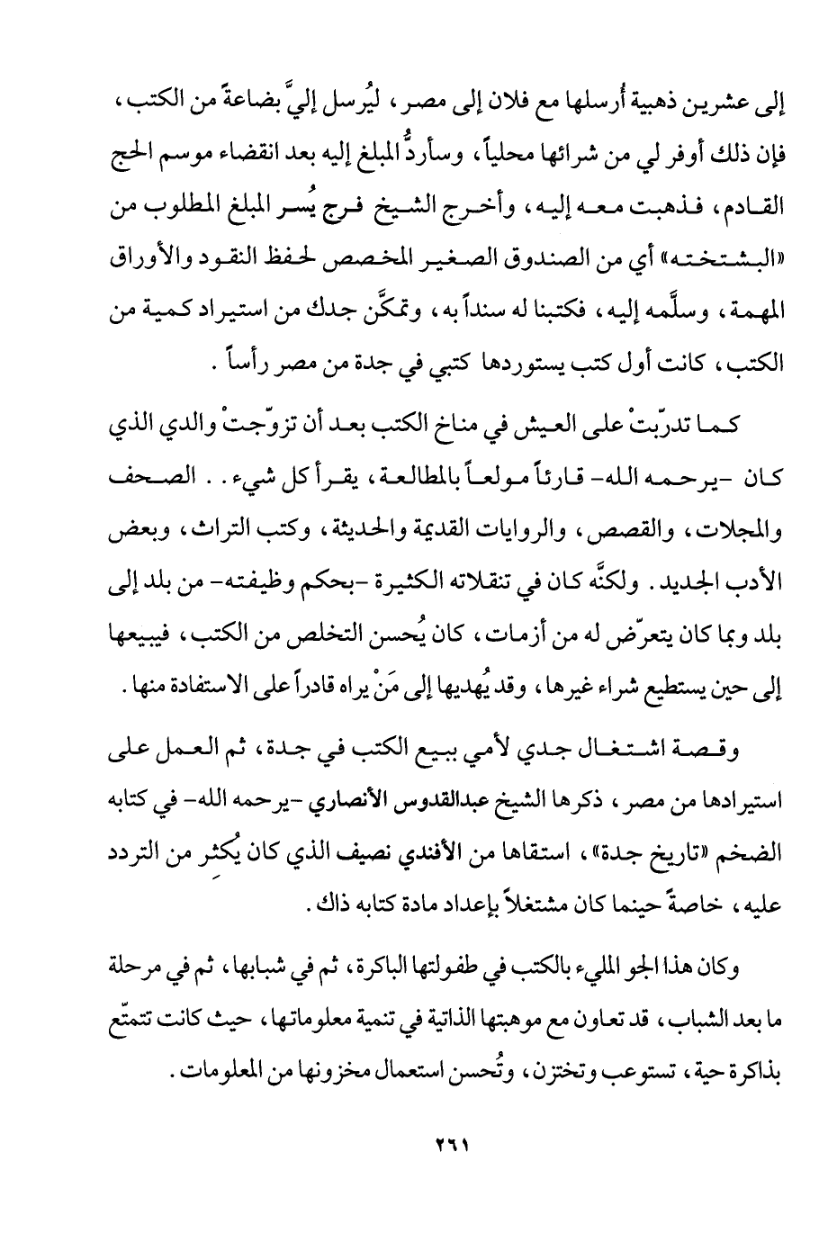 وقصة اشتغال جدي لأمي ببيع الكتب في جدة، ثم العمل على استيرادها من مصر، ذكرها الشيخ عبد القدوس الأنصاري -يرحمه الله- في كتابه الضخم "تاريخ جدة" استقاها من الأفندي نصيف الذي كان يكثر من التردد عليه، خاصة حينما كان مشتغلًا بإعداد مادة كتابه ذلك.
