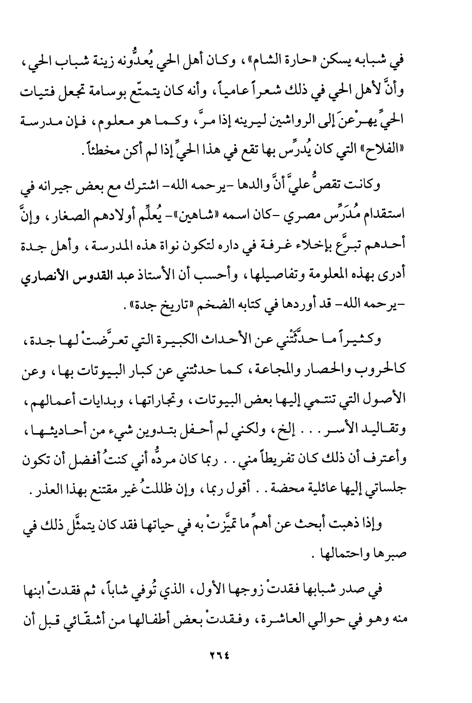 وكثيرًا ما حدثتني عن الأحداث الكبيرة التي تعرضت لها جدة، كالحروب والحصار والمجاعة، كما حدثتني عن كبار البيوتات بها، وعن الأصول التي تنتمي إليها بعض البيوتات، وتجاراتها، وبدايات أعمالهم، وتقاليد الأسر ... إلخ، ولكني لم أحفل بتدوين شيء من أحاديثها، وأعترف أن ذلك كان تفريطًا مني.. ربما كان مرده أني كنت أفضل أن تكون جلساتي إليها عائلية محضة.. أقول ربما، وإن ظللت غير مقتنع بهذا العذر.