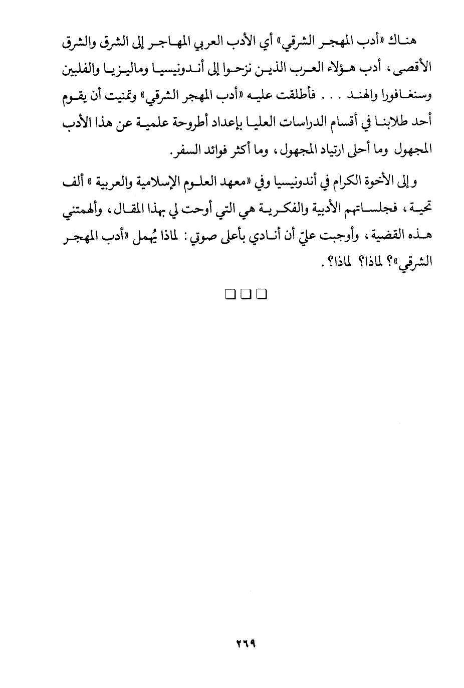 هناك "أدب المهجر الشرقي" أي الأدب العربي المهاجر إلى الشرق والشرق والأقصى، أدب هؤلاء العرب الذين نزحوا إلى اندونيسيا وماليزيا والفلبين وسنغافورا والهند.. فأطلقت عليه "أدب المهجر الشرقي، وتمنيت أن يقوم أحد طلابنا في أقسام الدراسات العليا بإعداد أطروحة علمية عن هذا الأدب المجهول وما أحلى ارتياد المجهول، وما أكثر فوائد السفر.