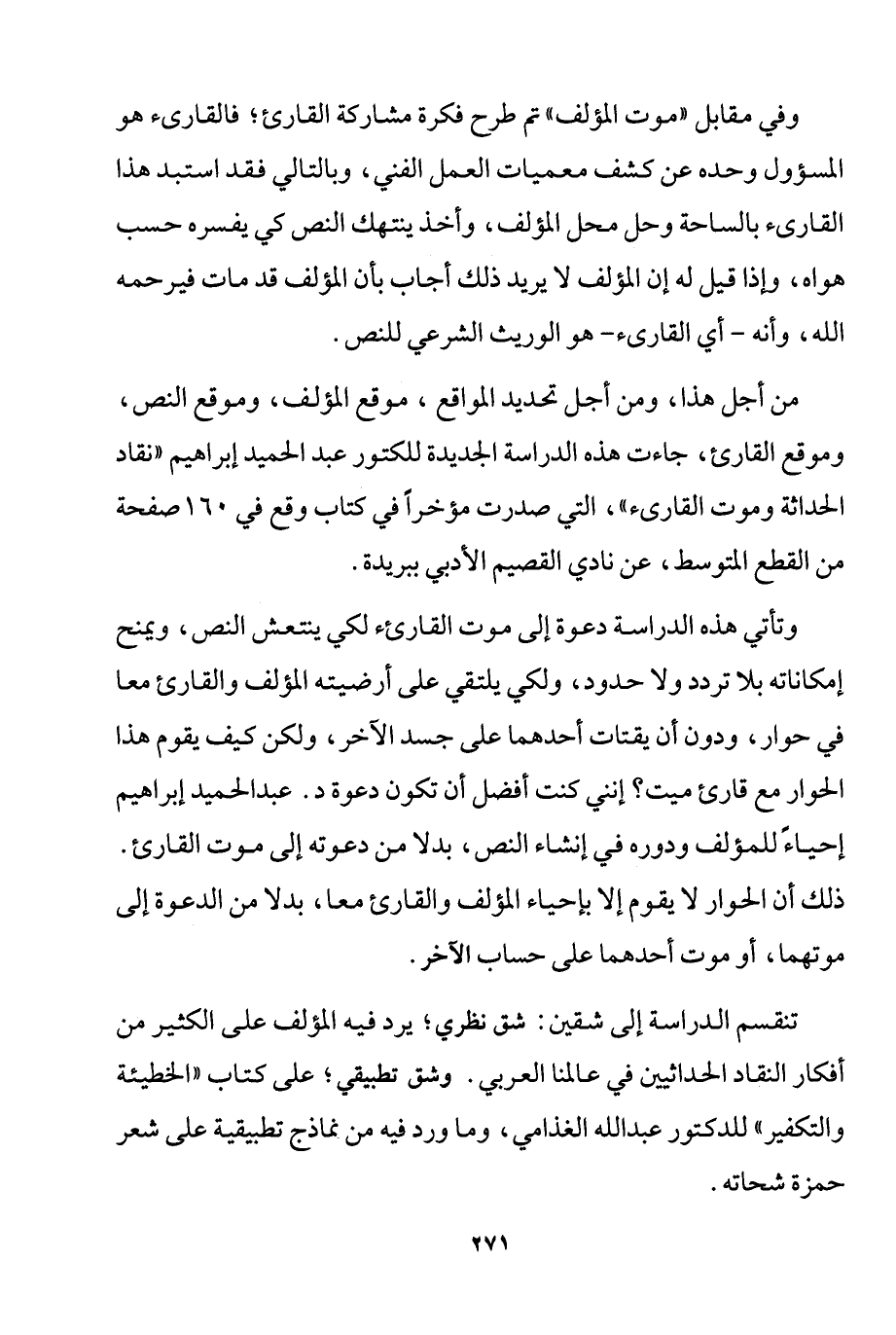 وتأتي هذه الدراسة دعوة إلى موت القارئ لكي ينتعش النص، ويمنح إمكاناته بلا تردد ولا حدود، ولكي يلتقي على أرضيته المؤلف والقارئ معًا في حوار، ودون أن يقتات أحدهما على جسد الآخر، ولكن كيف يقوم هذا الحوار مع قارئ ميت؟ إنني كنت أفضل أن تكون دعوة د. عبد الحميد إبراهيم إحياء للمؤلف ودوره في إنشاء النص، بدلا من دعوته إلى موت القارئ. ذلك الحوار الذي لا يقوم إلا بإحياء المؤلف والقارئ معًا، بدلا من الدعوة إلى موتهما، أو موت أحدهما على حساب الآخر.
