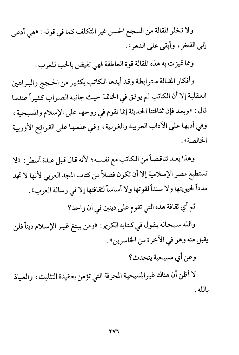 وهذا يعد تناقضًا من الكاتب من نفسه؛ لأنه قال قبل عدة أسطر: لا تستطيع مصر الإسلامية إلا أن تكون فصلًا من كتاب المجد العربي لأنها لا تجد مددًا لحيويتها ولا سندًا لقوتها ولا أساسًا لثقافتها إلا في رسالة العرب".