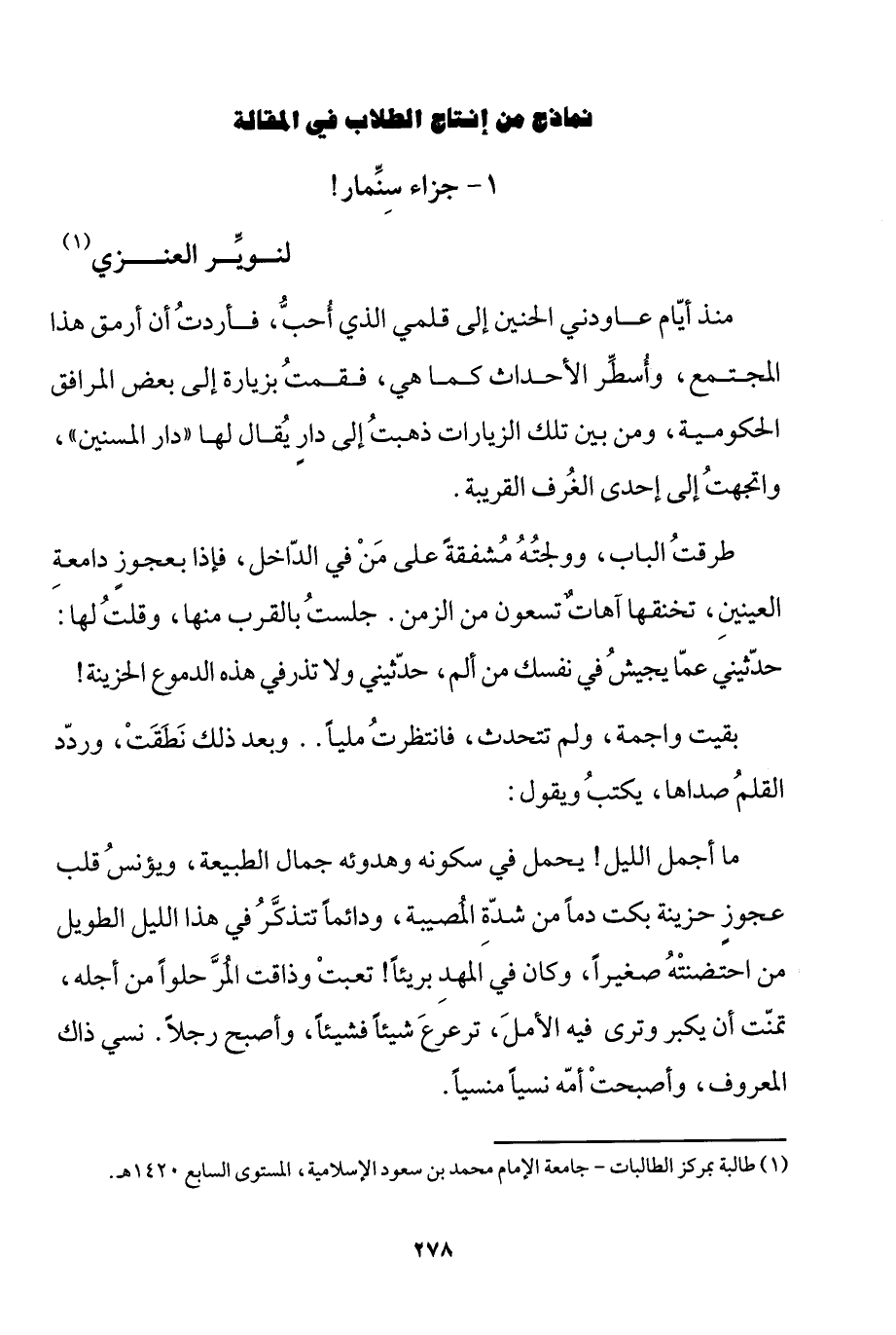 1 طالبة بمركز الطالبات، جامعة الإمام محمد بن سعود الإسلامية، المستوى السابع 1420هـ.