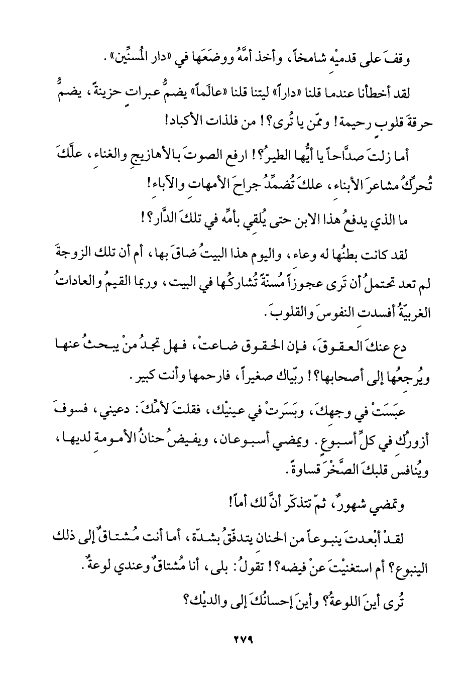 عبست في وجهك، وبَسَرت في عينيك، فقلت لأمك: دعيني، فسوف أزورك في كل أسبوع، ويمضي أسبوعان، ويفيض حنان الأمومة لديها، وينافس قلبُكَ الصخرَ قساوةً.