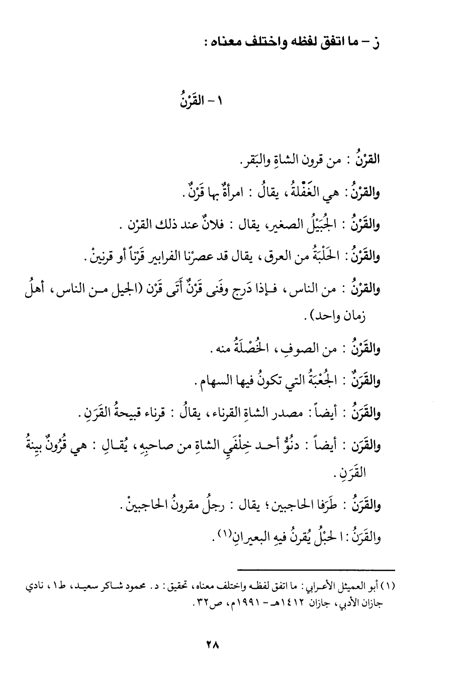 1 أبو العميثل الأعرابي: ما اتفق لفظه واختلف معناه، تحقيق، د. محمود شاكر سعيد، ط1، نادي جازان الأدبي، جازان 1412هـ، 1991م، ص32.