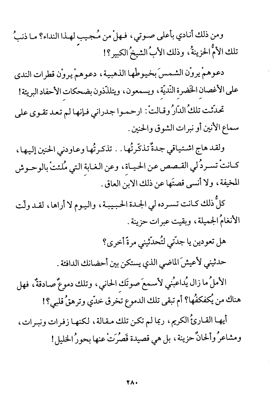 ولقد هاج اشتياقي جدة تذكرتها.. تذكرتها وعاودني الحنين إليها، كانت تسرد لي القصص عن الحياة، وعن الغابة التي ملئت بالوحوش المخيفة، ولا أنسى قصتها عن ذلك الابن العاق.