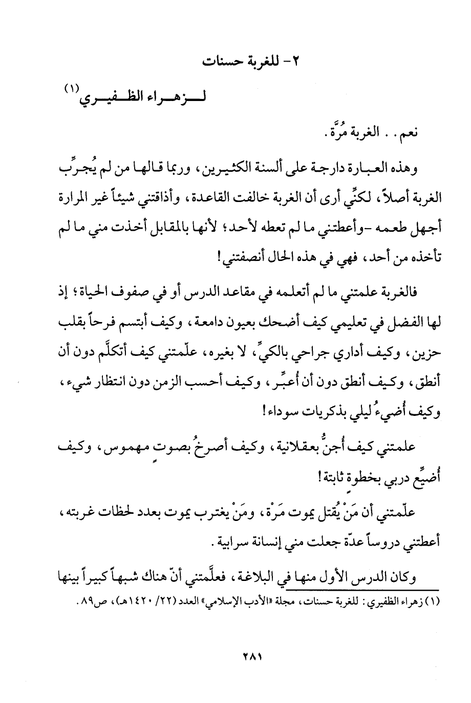 1 زهراء الظفيري: للغربة حسنات، مجلة "الأدب الإسلامي" العدد "22/ 1420هـ"، ص89.