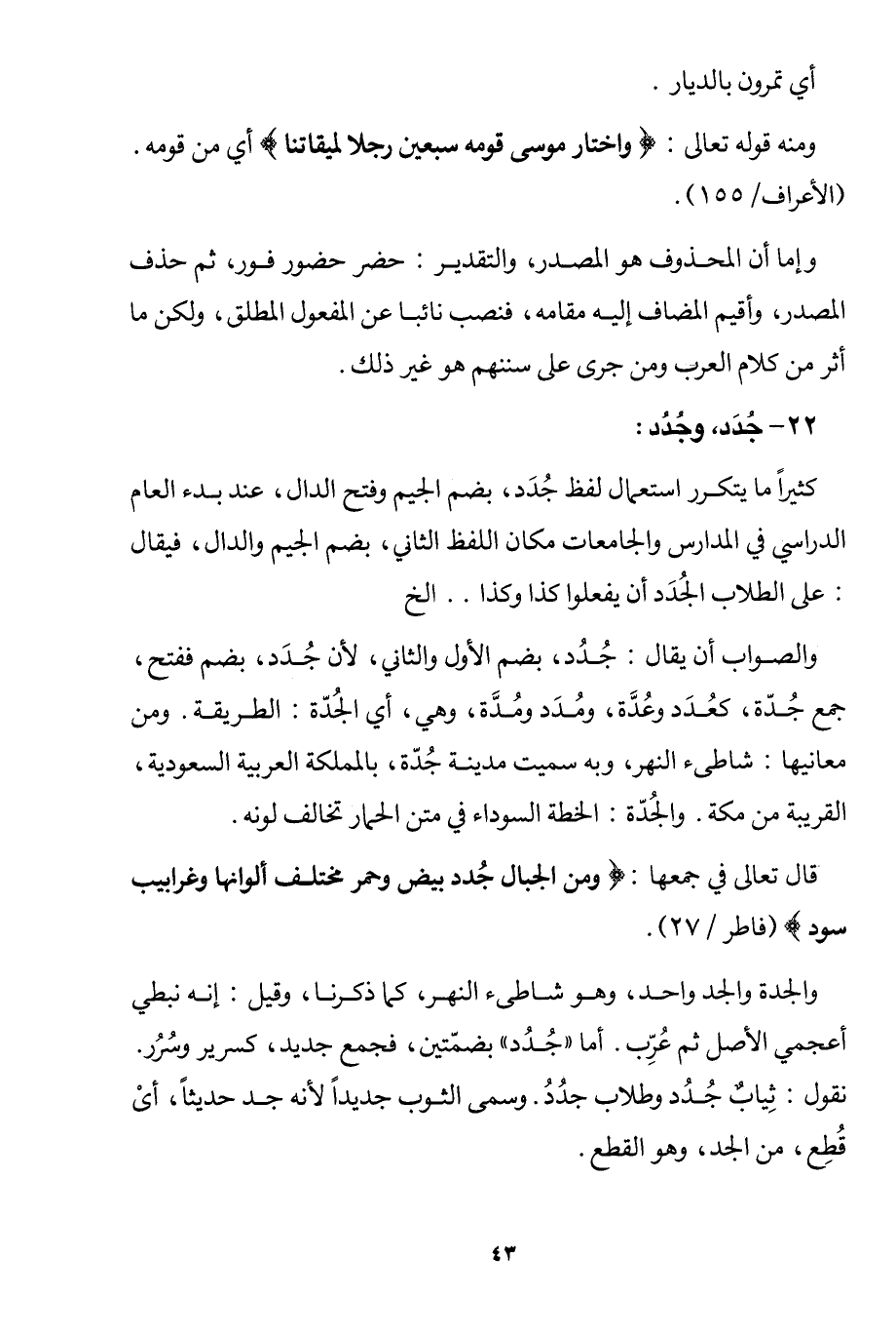 والجدة والجد واحد، وهو شاطئ البحر، كما ذكرنا، وقيل: إنه نبطي أعجمي الأصل ثم عرب. أما "جدد" بضمتين، فجمع جديد، كسرير وسرر. نقول: ثياب جدد وطلاب جدد. وسمي الثوب جديدا لأنه جد حديثًا، أي قُطع، من الجد، وهو القطع.
