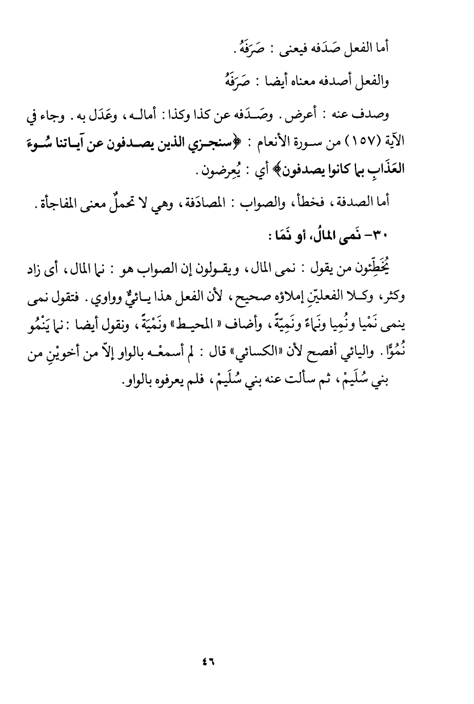 يخطّئون من يقول: نمى المال، ويقولون: إن الصواب هو: نما المال، أي زاد وكثر، وكلا الفعلين إملاؤه صحيح؛ لأن الفعل هذا يائي وواوي. فتقول: نمى ينمي نميا ونَمْيًا ونَماءًا ونَمِيَّة، وأضاف" المحيط": ونمية، ونقول أيضًا: نما يَنْمو نموًّا. واليائي أفصح؛ لأن "الكسائي" قال: لم أسمعه بالواو إلا من أخوين من بني سُليم، ثم سألت عنه بني سليم، فلم يعرفوه بالواو.