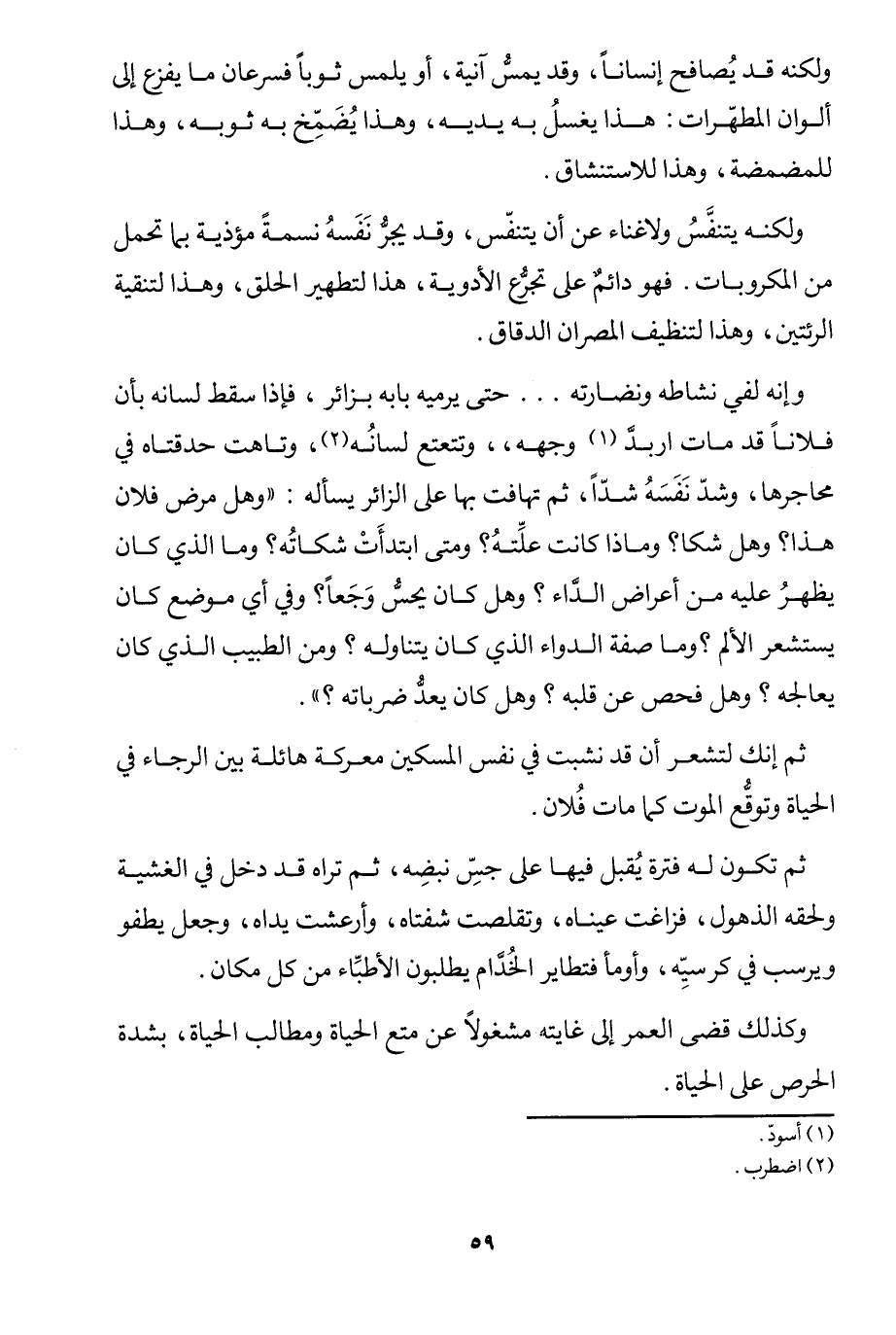 ثم إنك لتشعر أن قد نشبت في نفس المسكين معركة هائلة بين الرجاء في الحياة وتوقع الموت كما مات فلان.