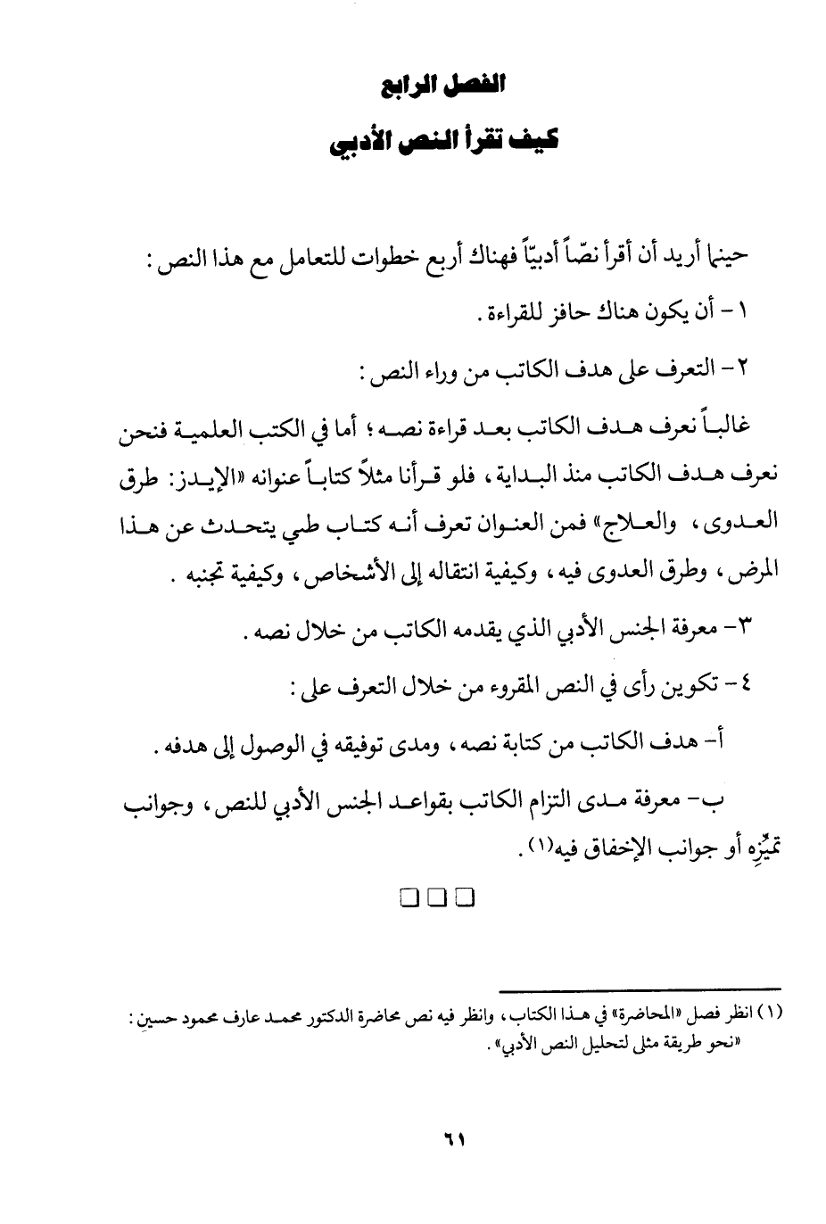 1 انظر فصل "المحاضرة" في هذا الكتاب، وانظر فيه نص محاضرة الدكتور محمد عارف محمود حسين: "نحو طريقة مثلى لتحليل النص الأدبي".
