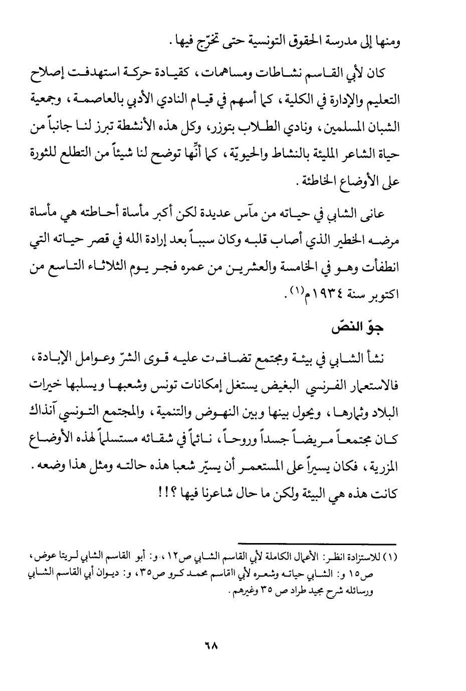 1 للاستزادة انظر: الأعمال الكاملة لأبي القاسم الشابي، ص12، و: أبو القاسم الشابي لريتا عوض، ص15، و: الشابي حياته وشعره لأبي القاسم محمد كرو ص35، و: ديوان أبي القاسم الشابي ورسائله شرح مجيد طراد، ص 35 وغيرهم.