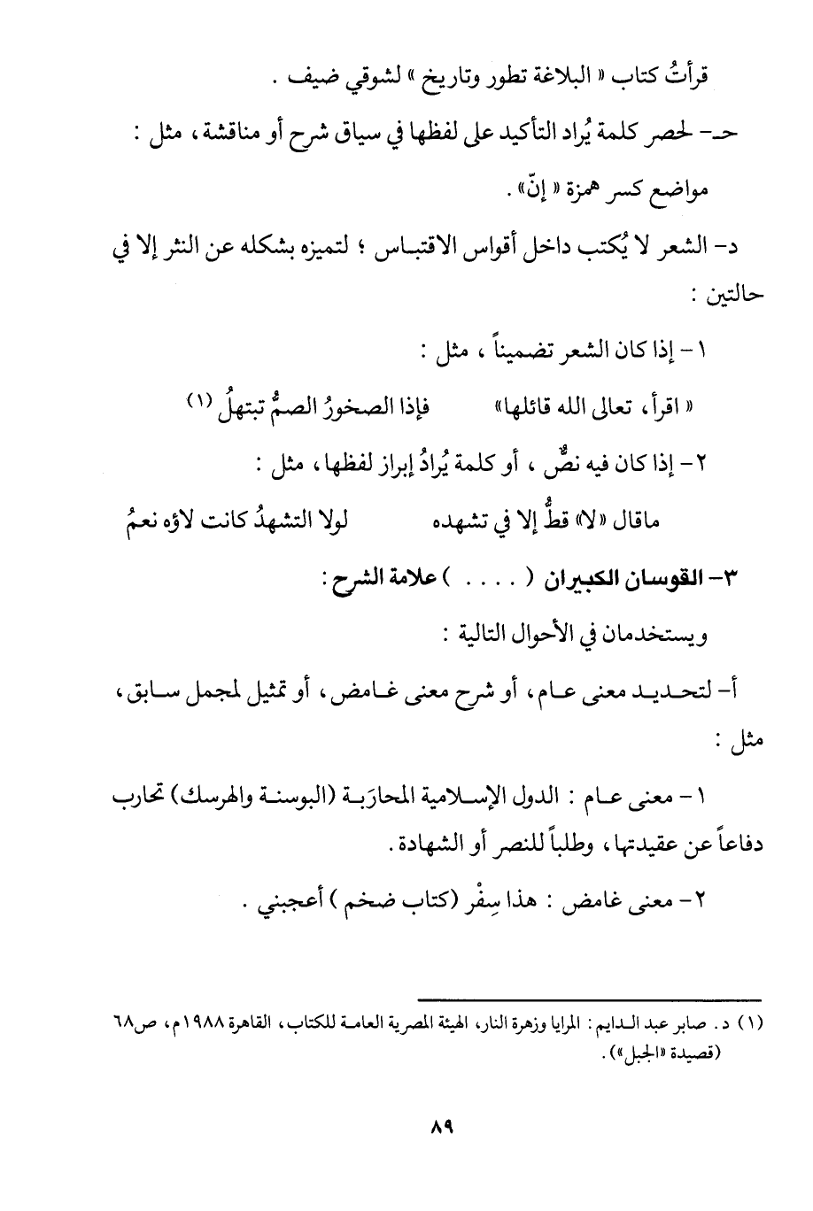 د- الشعر لا يكتب داخل أقواس الاقتباس؛ لتميزه بشكله عن النثر، إلا في حالتين: