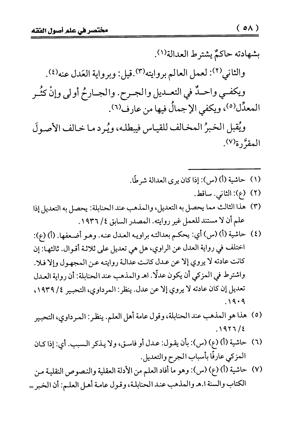 (¬7) حاشية (أ) (ع) (س): وهو ما أفاد العلم من الأدلة العقلية والنصوص النقلية من الكتاب والسنة أ. هـ والمذهب عند الحنابلة، وقول عامة أهل العلم: أن الخبر مقدم وإن خالف الأصول. ينظر: المرداوي، التحبير 5/ 2129.