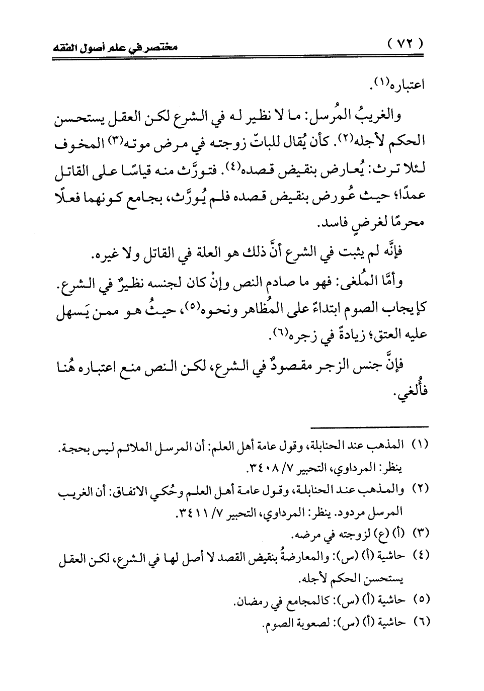 والغريب المرسل: ما لا نظير له في الشرع لكن العقل يستحسن الحكم لأجله (¬2). كأن يقال للباتّ زوجته في مرض موته (¬3) المخوف لئلا ترث: يعارض بنقيض قصده (¬4). فتورث منه قياسا على القاتل عمداً، حيث عورض بنقيض قصده فلم يورث، بجامع كونهما فعلا محرما لغرض فاسد.