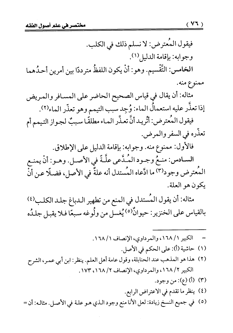 (¬5) في جميع النسخ زيادة: لعل الأنا منع وجود الذي هو علة في الأصل. مثاله: أن يقال في الكلب حيوان. ولعل الصواب حذفه.