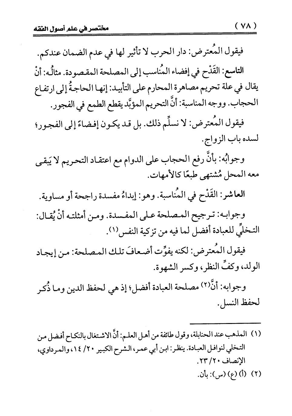 التاسع: القدح في إفضاء المناسب إلى المصلحة المقصودة. مثاله: أن يقال في علة تحريم مصاهرة المحارم على التأبيد: إنها الحاجة إلى ارتفاع الحجاب. ووجه المناسبة: أن التحريم المؤبد يقطع الطمع في الفجور.