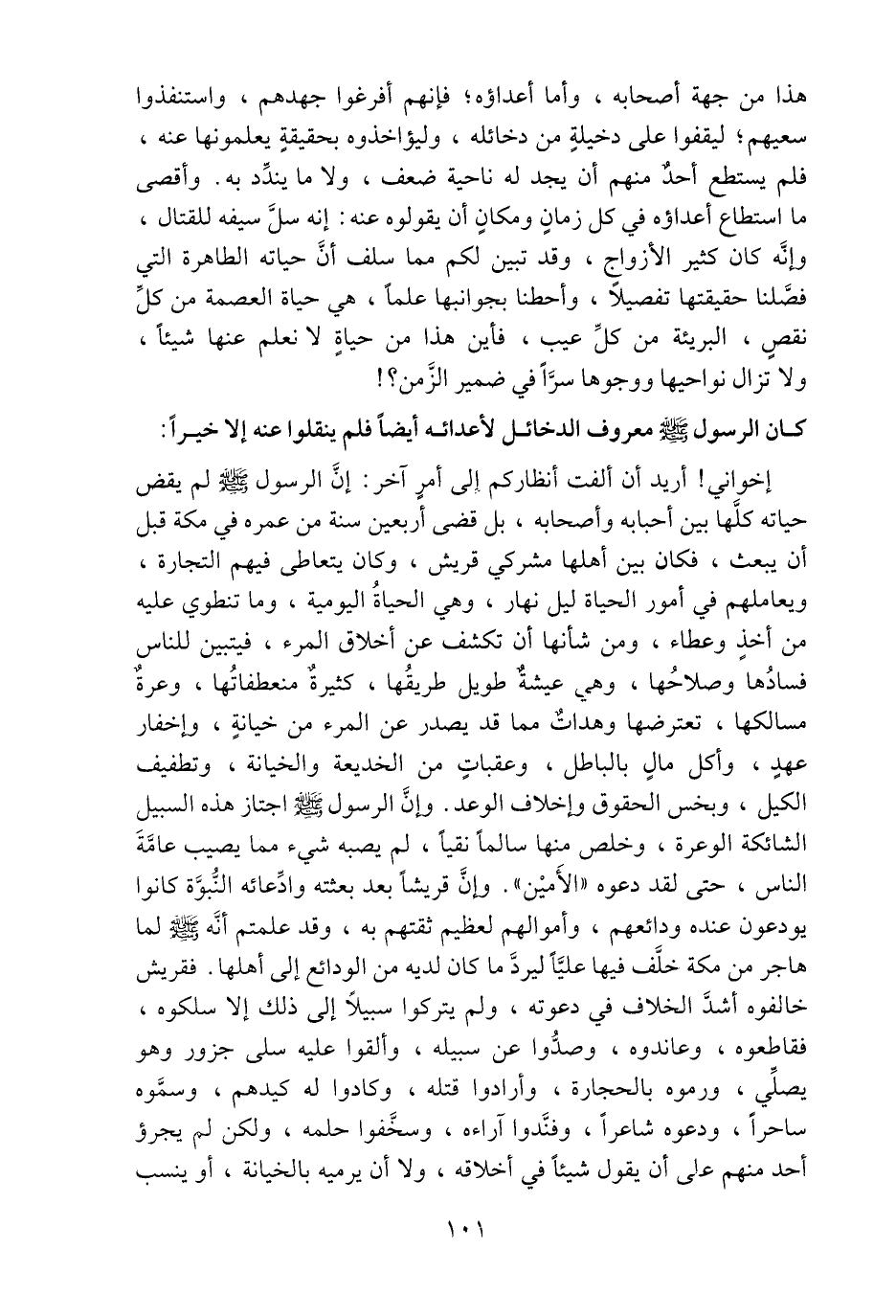 إخواني! أريد أن ألفت أنظاركم إلى أمر آخر: إنّ الرسول صلّى الله عليه وسلم لم يقض حياته كلّها بين أحبابه وأصحابه، بل قضى أربعين سنة من عمره في مكة قبل أن يبعث، فكان بين أهلها مشركي قريش، وكان يتعاطى فيهم التجارة، ويعاملهم في أمور الحياة ليل نهار، وهي الحياة اليومية، وما تنطوي عليه من أخذ وعطاء، ومن شأنها أن تكشف عن أخلاق المرء، فيتبين للناس فسادها وصلاحها، وهي عيشة طويل طريقها، كثيرة منعطفاتها، وعرة مسالكها، تعترضها وهدات مما قد يصدر عن المرء من خيانة، وإخفار عهد، وأكل مال بالباطل، وعقبات من الخديعة والخيانة، وتطفيف الكيل، وبخس الحقوق وإخلاف الوعد. وإنّ الرسول صلّى الله عليه وسلم اجتاز هذه السبيل الشائكة الوعرة، وخلص منها سالما نقيا، لم يصبه شيء مما يصيب عامّة الناس، حتى لقد دعوه «الأمين» . وإنّ قريشا بعد بعثته وادّعائه النّبوّة كانوا يودعون عنده ودائعهم، وأموالهم لعظيم ثقتهم به، وقد علمتم أنّه صلّى الله عليه وسلم لما هاجر من مكة خلّف فيها عليّا ليردّ ما كان لديه من الودائع إلى أهلها. فقريش خالفوه أشدّ الخلاف في دعوته، ولم يتركوا سبيلا إلى ذلك إلا سلكوه، فقاطعوه، وعاندوه، وصدّوا عن سبيله، وألقوا عليه سلى جزور وهو يصلّي، ورموه بالحجارة، وأرادوا قتله، وكادوا له كيدهم، وسمّوه ساحرا، ودعوه شاعرا، وفنّدوا آراءه، وسخّفوا حلمه، ولكن لم يجرؤ أحد منهم على أن يقول شيئا في أخلاقه، ولا أن يرميه بالخيانة، أو ينسب