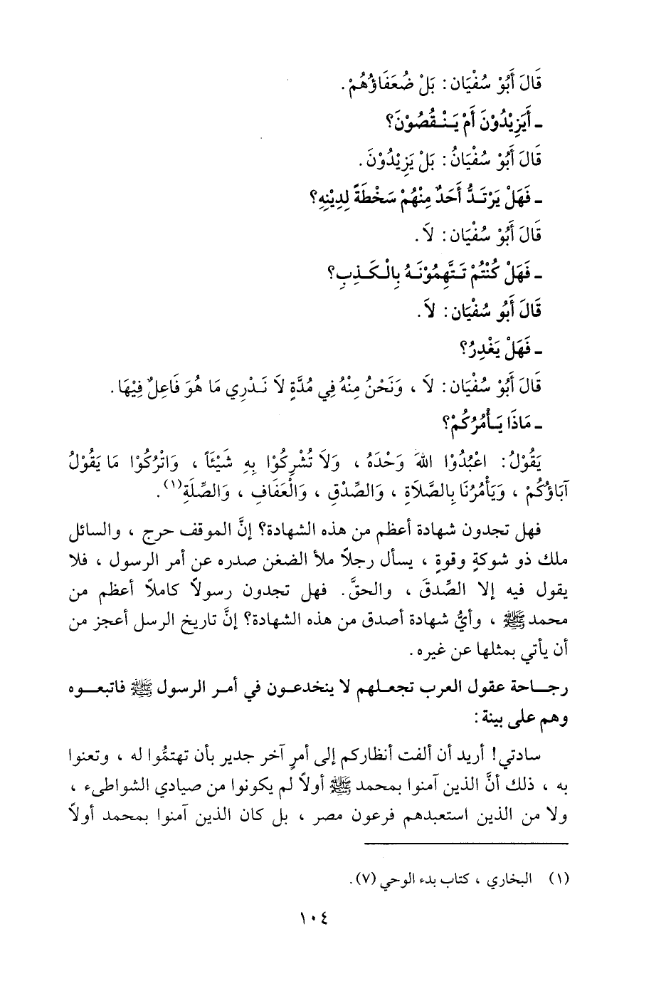 فهل تجدون شهادة أعظم من هذه الشهادة؟ إنّ الموقف حرج، والسائل ملك ذو شوكة وقوة، يسأل رجلا ملأ الضغن صدره عن أمر الرسول، فلا يقول فيه إلا الصّدق، والحقّ. فهل تجدون رسولا كاملا أعظم من محمد صلّى الله عليه وسلم، وأيّ شهادة أصدق من هذه الشهادة؟ إنّ تاريخ الرسل أعجز من أن يأتي بمثلها عن غيره.