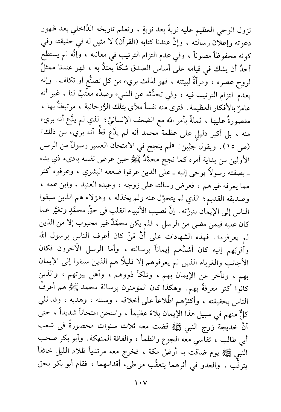 نزول الوحي العظيم عليه نوبة بعد نوبة، ونعلم تاريخه الدّاخلي بعد ظهور دعوته وإعلان رسالته، وإنّ عندنا كتابه (القرآن) لا مثيل له في حقيقته وفي كونه محفوظا مصونا، وفي عدم التزام الترتيب في معانيه، وإنّه لم يستطع أحد أن يشك في قيامه على أساس الصدق شكّا يعتدّ به، فهو عندنا ممثل لروح عصره، ومرآة لبيئته، فهو لذلك بريء من كل تصنّع أو تكلف. وإنه بعدم التزام الترتيب فيه، وفي تحدّثه عن الشيء وضدّه معتب لنا، غير أنه عامر بالأفكار العظيمة. فترى منه نفسا ملأى بتلك الرّوحانية، مرتبطة بها، مقصورة عليها، ثملة بأمر الله مع الضعف الإنسانيّ؛ الذي لم يدّع أنه بريء منه، بل أكبر دليل على عظمة محمد أنه لم يدّع قطّ أنه بريء من ذلك» (ص 15) . ويقول جيّبن: «لم ينجح في الامتحان العسير رسول من الرسل الأولين من بداية أمره كما نجح محمّد صلّى الله عليه وسلم حين عرض نفسه بادىء ذي بدء بصفته رسولا يوحى إليه- على الذين عرفوا ضعفه البشري، وعرفوه أكثر مما يعرفه غيرهم، فعرض رسالته على زوجه، وعبده العنيد، وابن عمه، وصديقه القديم؛ الذي لم يتحوّل عنه ولم يخذله، وهؤلاء هم الذين سبقوا الناس إلى الإيمان بنبوّته. إنّ نصيب الأنبياء انقلب في حقّ محمّد وتغيّر عما كان عليه فيمن مضى من الرسل، فلم يكن محمّد غير محبوب إلا من الذين لم يعرفوه» . فهذه الشهادات على أنّ من كان أعرف الناس برسول الله وأقربهم إليه كان أشدّهم إيمانا برسالته، وأما الرسل الآخرون فكان الأجانب والغرباء الذين لم يعرفوهم إلا قليلا هم الذين سبقوا إلى الإيمان بهم، وتأخر عن الإيمان بهم، وتلكأ ذووهم، وأهل بيوتهم، والذين كانوا أكثر معرفة بهم. وهكذا كان المؤمنون برسالة محمد صلّى الله عليه وسلم هم أعرف الناس بحقيقته، وأكثرهم اطّلاعا على أخلاقه، وسننه، وهديه، وقد بلي كلّ منهم في سبيل هذا الإيمان بلاء عظيما، وامتحن امتحانا شديدا، حتى أنّ خديجة زوج النبي صلّى الله عليه وسلم قضت معه ثلاث سنوات محصورة في شعب أبي طالب، تقاسي معه الجوع والظمأ، والفاقة المنهكة. وأبو بكر صحب النبي صلّى الله عليه وسلم يوم ضاقت به أرض مكة، فخرج معه مرتديا ظلام الليل خائفا يترقّب، والعدو في أثرهما يتعقّب مواطىء أقدامهما، فقام أبو بكر بحق