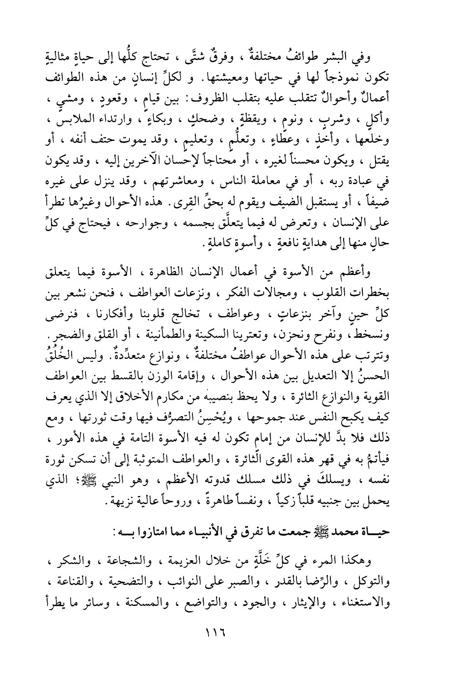 وتترتب على هذه الأحوال عواطف مختلفة، ونوازع متعدّدة. وليس الخلق الحسن إلا التعديل بين هذه الأحوال، وإقامة الوزن بالقسط بين العواطف القوية والنوازع الثائرة، ولا يحظ بنصيبه من مكارم الأخلاق إلا الذي يعرف كيف يكبح النفس عند جموحها، ويحسن التصرّف فيها وقت ثورتها، ومع ذلك فلا بدّ للإنسان من إمام تكون له فيه الأسوة التامة في هذه الأمور، فيأتمّ به في قهر هذه القوى الثائرة، والعواطف المتوثبة إلى أن تسكن ثورة نفسه، ويسلك في ذلك مسلك قدوته الأعظم، وهو النبي صلّى الله عليه وسلم؛ الذي يحمل بين جنبيه قلبا زكيا، ونفسا طاهرة، وروحا عالية نزيهة.