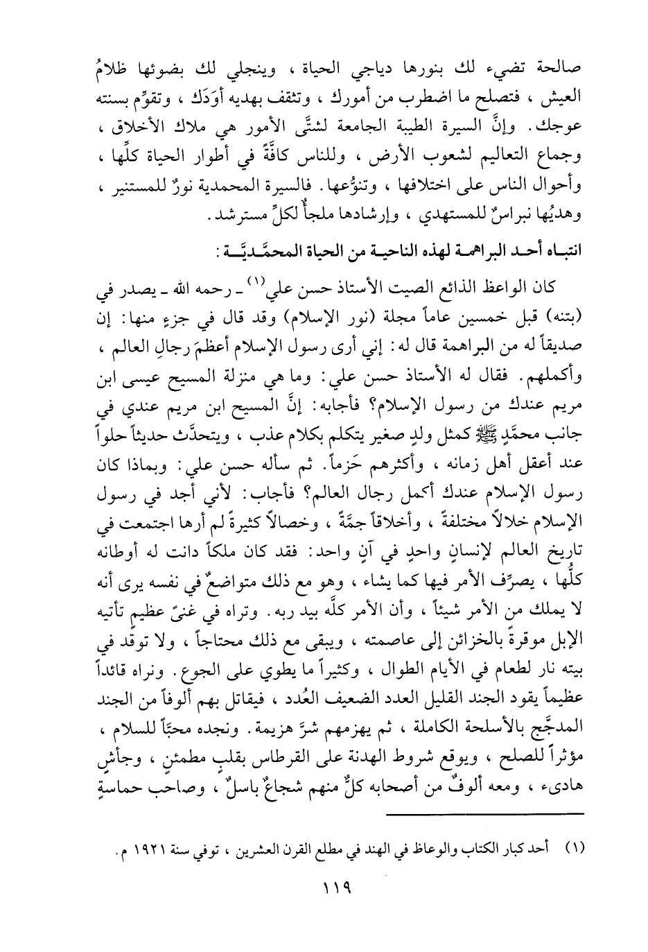 كان الواعظ الذائع الصيت الأستاذ حسن علي «1» - رحمه الله- يصدر في (بتنه) قبل خمسين عاما مجلة (نور الإسلام) وقد قال في جزء منها: إن صديقا له من البراهمة قال له: إني أرى رسول الإسلام أعظم رجال العالم، وأكملهم. فقال له الأستاذ حسن علي: وما هي منزلة المسيح عيسى ابن مريم عندك من رسول الإسلام؟ فأجابه: إنّ المسيح ابن مريم عندي في جانب محمّد صلّى الله عليه وسلم كمثل ولد صغير يتكلم بكلام عذب، ويتحدّث حديثا حلوا عند أعقل أهل زمانه، وأكثرهم حزما. ثم سأله حسن علي: وبماذا كان رسول الإسلام عندك أكمل رجال العالم؟ فأجاب: لأني أجد في رسول الإسلام خلالا مختلفة، وأخلاقا جمّة، وخصالا كثيرة لم أرها اجتمعت في تاريخ العالم لإنسان واحد في آن واحد: فقد كان ملكا دانت له أوطانه كلّها، يصرّف الأمر فيها كما يشاء، وهو مع ذلك متواضع في نفسه يرى أنه لا يملك من الأمر شيئا، وأن الأمر كلّه بيد ربه. وتراه في غنى عظيم تأتيه الإبل موقرة بالخزائن إلى عاصمته، ويبقى مع ذلك محتاجا، ولا توقد في بيته نار لطعام في الأيام الطوال، وكثيرا ما يطوي على الجوع. ونراه قائدا عظيما يقود الجند القليل العدد الضعيف العدد، فيقاتل بهم ألوفا من الجند المدجّج بالأسلحة الكاملة، ثم يهزمهم شرّ هزيمة. ونجده محبّا للسلام، مؤثرا للصلح، ويوقع شروط الهدنة على القرطاس بقلب مطمئن، وجأش هادىء، ومعه ألوف من أصحابه كلّ منهم شجاع باسل، وصاحب حماسة