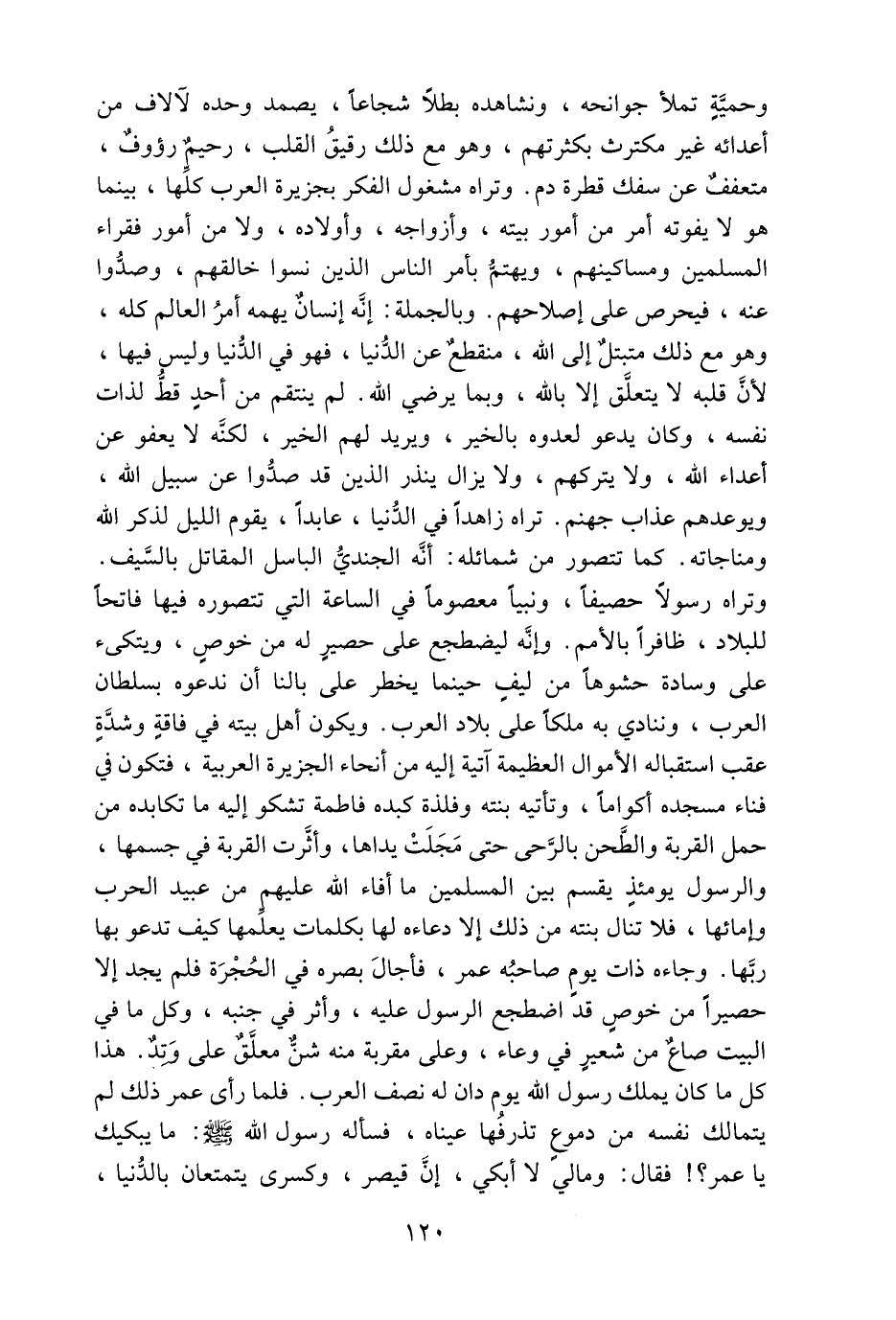 وحميّة تملأ جوانحه، ونشاهده بطلا شجاعا، يصمد وحده لآلاف من أعدائه غير مكترث بكثرتهم، وهو مع ذلك رقيق القلب، رحيم رؤوف، متعفف عن سفك قطرة دم. وتراه مشغول الفكر بجزيرة العرب كلّها، بينما هو لا يفوته أمر من أمور بيته، وأزواجه، وأولاده، ولا من أمور فقراء المسلمين ومساكينهم، ويهتمّ بأمر الناس الذين نسوا خالقهم، وصدّوا عنه، فيحرص على إصلاحهم. وبالجملة: إنّه إنسان يهمه أمر العالم كله، وهو مع ذلك متبتل إلى الله، منقطع عن الدّنيا، فهو في الدّنيا وليس فيها، لأنّ قلبه لا يتعلّق إلا بالله، وبما يرضي الله. لم ينتقم من أحد قطّ لذات نفسه، وكان يدعو لعدوه بالخير، ويريد لهم الخير، لكنّه لا يعفو عن أعداء الله، ولا يتركهم، ولا يزال ينذر الذين قد صدّوا عن سبيل الله، ويوعدهم عذاب جهنم. تراه زاهدا في الدّنيا، عابدا، يقوم الليل لذكر الله ومناجاته. كما تتصور من شمائله: أنّه الجنديّ الباسل المقاتل بالسّيف.