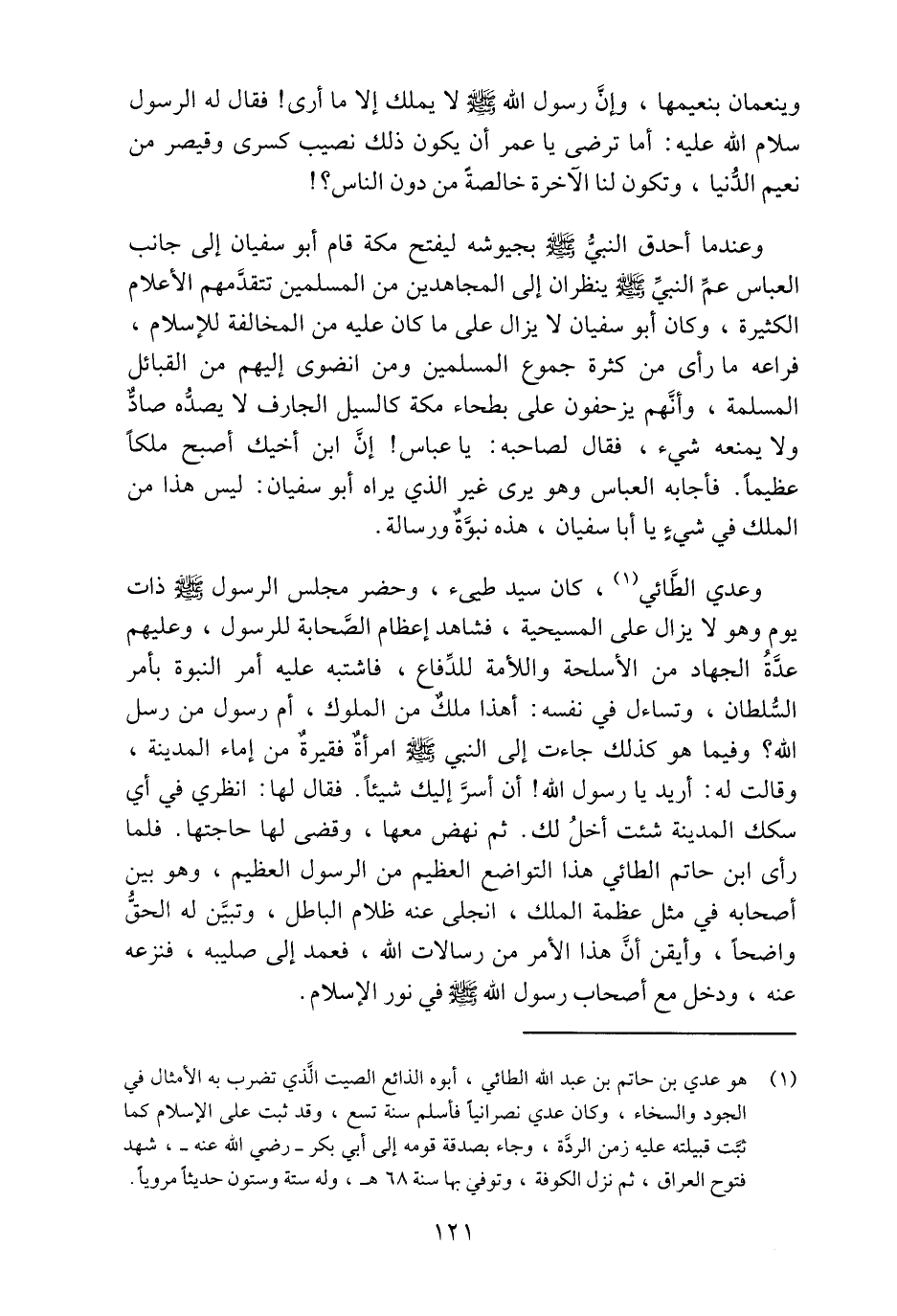 وعدي الطّائي «1» ، كان سيد طيىء، وحضر مجلس الرسول صلّى الله عليه وسلم ذات يوم وهو لا يزال على المسيحية، فشاهد إعظام الصّحابة للرسول، وعليهم عدّة الجهاد من الأسلحة واللأمة للدّفاع، فاشتبه عليه أمر النبوة بأمر السّلطان، وتساءل في نفسه: أهذا ملك من الملوك، أم رسول من رسل الله؟ وفيما هو كذلك جاءت إلى النبي صلّى الله عليه وسلم امرأة فقيرة من إماء المدينة، وقالت له: أريد يا رسول الله! أن أسرّ إليك شيئا. فقال لها: انظري في أي سكك المدينة شئت أخل لك. ثم نهض معها، وقضى لها حاجتها. فلما رأى ابن حاتم الطائي هذا التواضع العظيم من الرسول العظيم، وهو بين أصحابه في مثل عظمة الملك، انجلى عنه ظلام الباطل، وتبيّن له الحقّ واضحا، وأيقن أنّ هذا الأمر من رسالات الله، فعمد إلى صليبه، فنزعه عنه، ودخل مع أصحاب رسول الله صلّى الله عليه وسلم في نور الإسلام.
