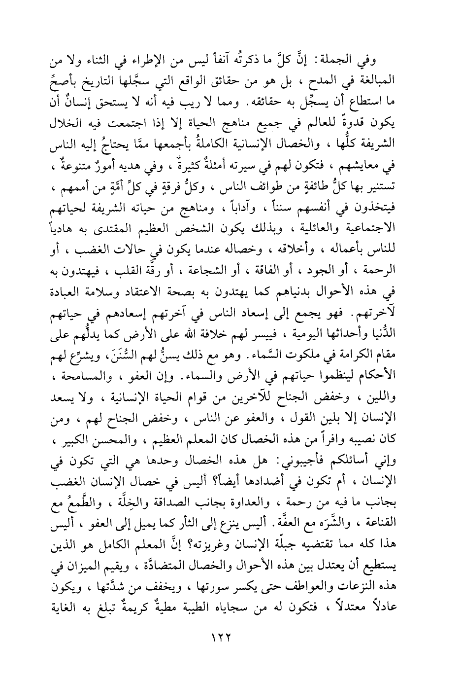 وفي الجملة: إنّ كلّ ما ذكرته آنفا ليس من الإطراء في الثناء ولا من المبالغة في المدح، بل هو من حقائق الواقع التي سجّلها التاريخ بأصحّ ما استطاع أن يسجّل به حقائقه. ومما لا ريب فيه أنه لا يستحق إنسان أن يكون قدوة للعالم في جميع مناهج الحياة إلا إذا اجتمعت فيه الخلال الشريفة كلّها، والخصال الإنسانية الكاملة بأجمعها ممّا يحتاج إليه الناس في معايشهم، فتكون لهم في سيرته أمثلة كثيرة، وفي هديه أمور متنوعة، تستنير بها كلّ طائفة من طوائف الناس، وكلّ فرقة في كلّ أمّة من أممهم، فيتخذون في أنفسهم سننا، وآدابا، ومناهج من حياته الشريفة لحياتهم الاجتماعية والعائلية، وبذلك يكون الشخص العظيم المقتدى به هاديا للناس بأعماله، وأخلاقه، وخصاله عند ما يكون في حالات الغضب، أو الرحمة، أو الجود، أو الفاقة، أو الشجاعة، أو رقّة القلب، فيهتدون به في هذه الأحوال بدنياهم كما يهتدون به بصحة الاعتقاد وسلامة العبادة لآخرتهم. فهو يجمع إلى إسعاد الناس في آخرتهم إسعادهم في حياتهم الدّنيا وأحداثها اليومية، فييسر لهم خلافة الله على الأرض كما يدلّهم على مقام الكرامة في ملكوت السّماء. وهو مع ذلك يسنّ لهم السّنن، ويشرّع لهم الأحكام لينظموا حياتهم في الأرض والسماء. وإن العفو، والمسامحة، واللين، وخفض الجناح للآخرين من قوام الحياة الإنسانية، ولا يسعد الإنسان إلا بلين القول، والعفو عن الناس، وخفض الجناح لهم، ومن كان نصيبه وافرا من هذه الخصال كان المعلم العظيم، والمحسن الكبير، وإني أسائلكم فأجيبوني: هل هذه الخصال وحدها هي التي تكون في الإنسان، أم تكون في أضدادها أيضا؟ أليس في خصال الإنسان الغضب بجانب ما فيه من رحمة، والعداوة بجانب الصداقة والخلّة، والطّمع مع القناعة، والشّره مع العفّة. أليس ينزع إلى الثأر كما يميل إلى العفو، أليس هذا كله مما تقتضيه جبلّة الإنسان وغريزته؟ إنّ المعلم الكامل هو الذين يستطيع أن يعتدل بين هذه الأحوال والخصال المتضادّة، ويقيم الميزان في هذه النزعات والعواطف حتى يكسر سورتها، ويخفف من شدّتها، ويكون عادلا معتدلا، فتكون له من سجاياه الطيبة مطية كريمة تبلغ به الغاية