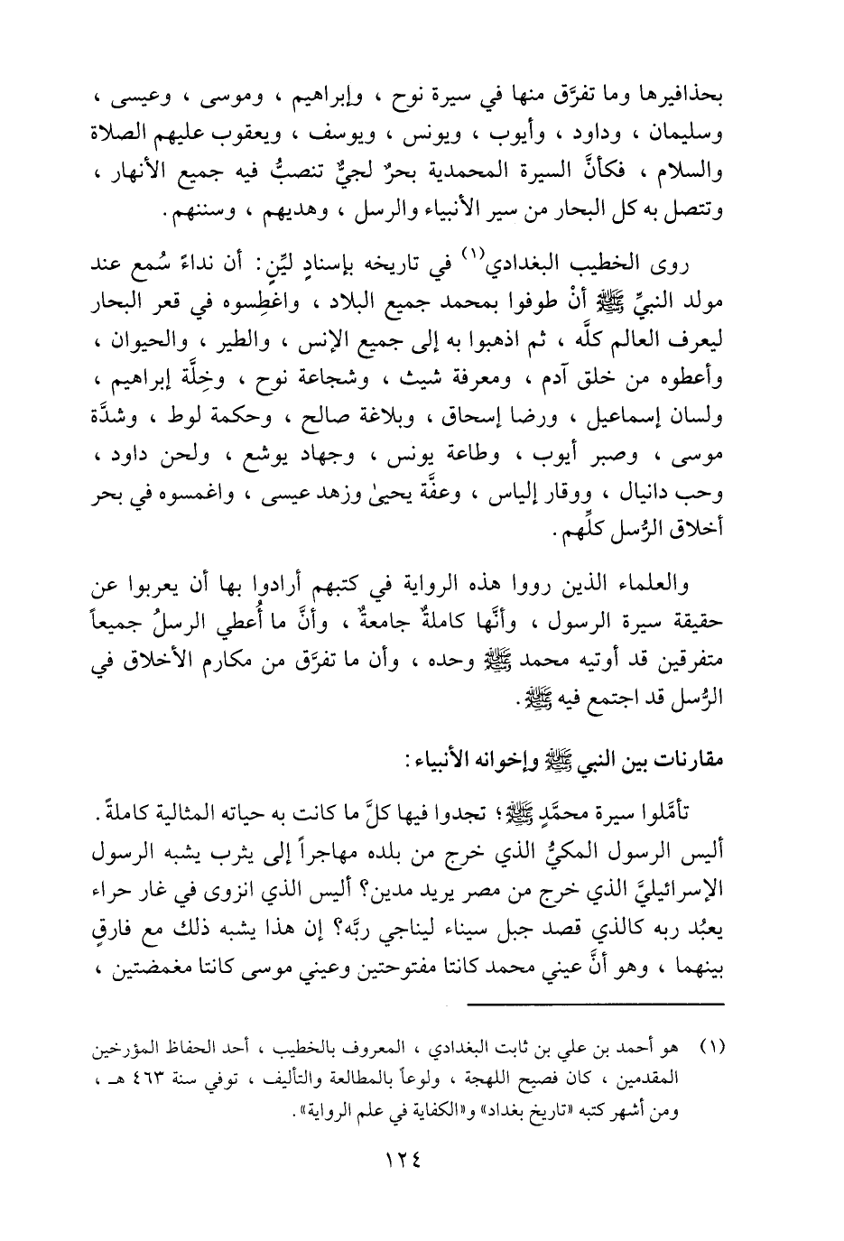 بحذافيرها وما تفرّق منها في سيرة نوح، وإبراهيم، وموسى، وعيسى، وسليمان، وداود، وأيوب، ويونس، ويوسف، ويعقوب عليهم الصلاة والسلام، فكأنّ السيرة المحمدية بحر لجيّ تنصبّ فيه جميع الأنهار، وتتصل به كل البحار من سير الأنبياء والرسل، وهداهم، وسننهم.