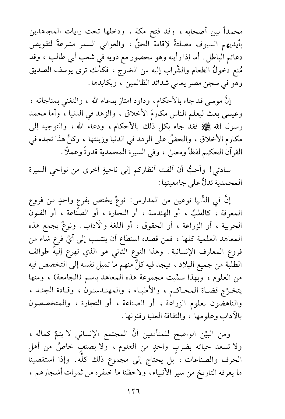 سادتي! وأحبّ أن ألفت أنظاركم إلى ناحية أخرى من نواحي السيرة المحمدية تدلّ على جامعيتها: