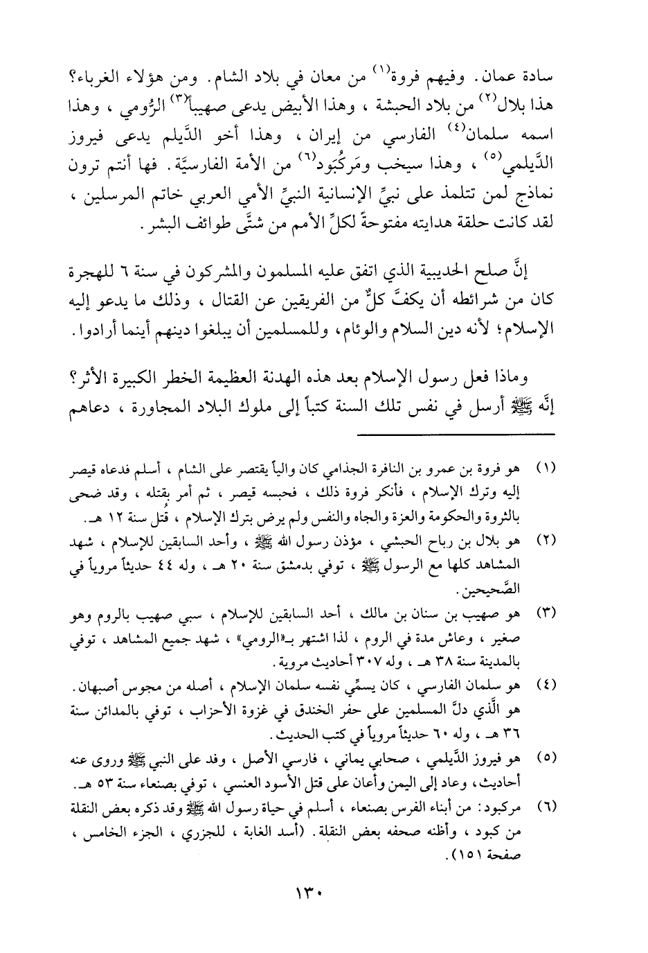 هذا بلال «2» من بلاد الحبشة، وهذا الأبيض يدعى صهيبا «3» الرّومي، وهذا اسمه سلمان «4» الفارسي من إيران، وهذا أخو الدّيلم يدعى فيروز الدّيلمي «5» ، وهذا سيخب ومركبود «6» من الأمة الفارسيّة. فها أنتم ترون نماذج لمن تتلمذ على نبيّ الإنسانية النبيّ الأمي العربي خاتم المرسلين، لقد كانت حلقة هدايته مفتوحة لكلّ الأمم من شتّى طوائف البشر.