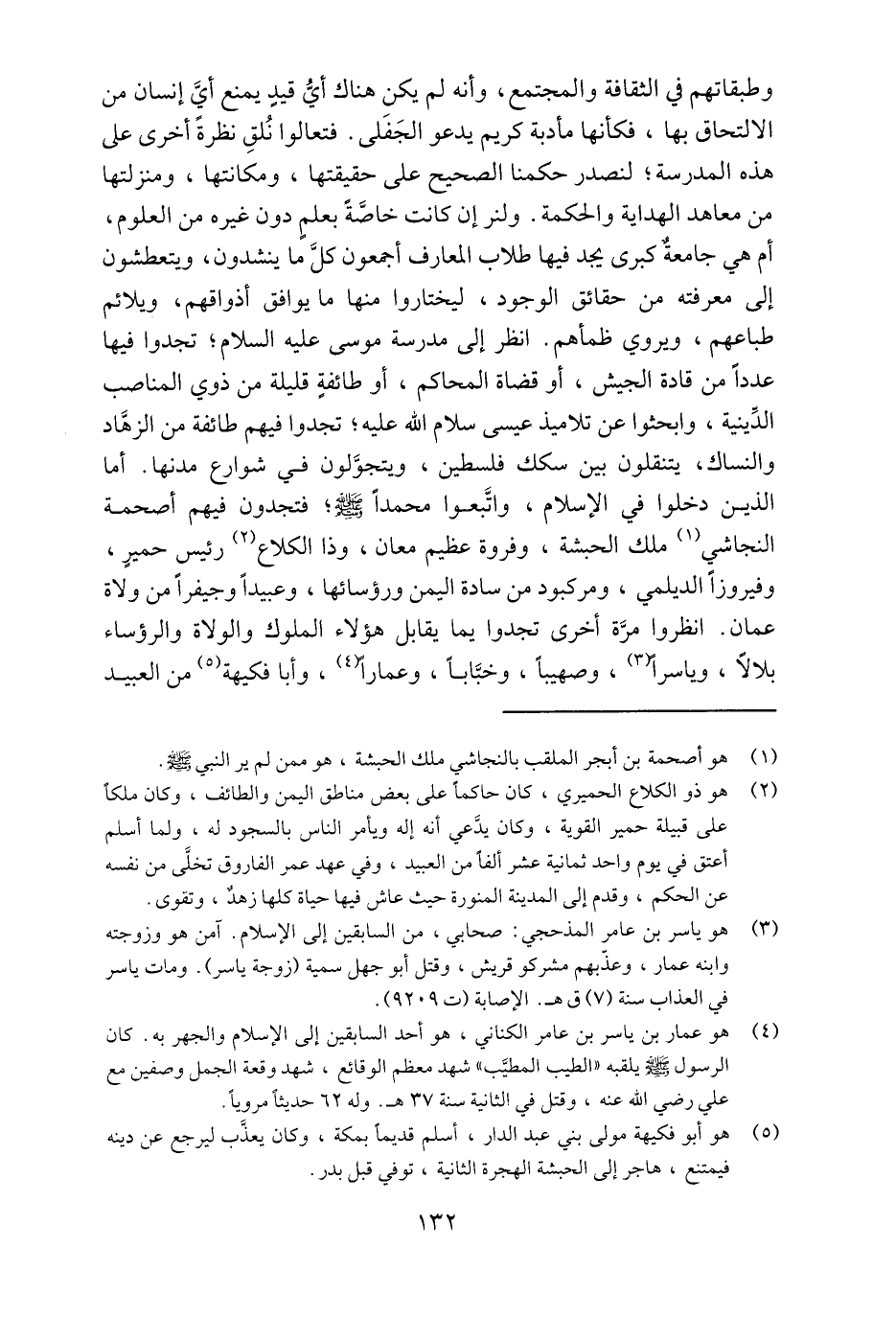 وطبقاتهم في الثقافة والمجتمع، وأنه لم يكن هناك أيّ قيد يمنع أيّ إنسان من الالتحاق بها، فكأنها مأدبة كريم يدعو الجفلى. فتعالوا نلق نظرة أخرى على هذه المدرسة؛ لنصدر حكمنا الصحيح على حقيقتها، ومكانتها، ومنزلتها من معاهد الهداية والحكمة. ولنر إن كانت خاصّة بعلم دون غيره من العلوم، أم هي جامعة كبرى يجد فيها طلاب المعارف أجمعون كلّ ما ينشدون، ويتعطشون إلى معرفته من حقائق الوجود، ليختاروا منها ما يوافق أذواقهم، ويلائم طباعهم، ويروي ظمأهم. انظر إلى مدرسة موسى عليه السلام؛ تجدوا فيها عددا من قادة الجيش، أو قضاة المحاكم، أو طائفة قليلة من ذوي المناصب الدّينية، وابحثوا عن تلاميذ عيسى سلام الله عليه؛ تجدوا فيهم طائفة من الزهّاد والنساك، يتنقلون بين سكك فلسطين، ويتجوّلون في شوارع مدنها. أما الذين دخلوا في الإسلام، واتّبعوا محمدا صلّى الله عليه وسلم؛ فتجدون فيهم أصحمة النجاشي «1» ملك الحبشة، وفروة عظيم معان، وذا الكلاع «2» رئيس حمير، وفيروزا الديلمي، ومركبود من سادة اليمن ورؤسائها، وعبيدا وجيفرا من ولاة عمان. انظروا مرّة أخرى تجدوا يما يقابل هؤلاء الملوك والولاة والرؤساء بلالا، وياسرا «3» ، وصهيبا، وخبّابا، وعمارا «4» ، وأبا فكيهة «5» من العبيد