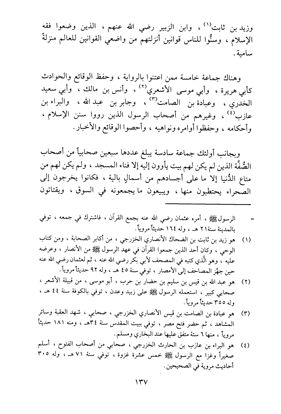 وهناك جماعة خامسة ممن اعتنوا بالرواية، وحفظ الوقائع والحوادث كأبي هريرة، وأبي موسى الأشعري «2» ، وأنس بن مالك، وأبي سعيد الخدري، وعبادة بن الصامت «3» ، وجابر بن عبد الله، والبراء بن عازب «4» ، وغيرهم من أصحاب الرسول الذين رووا سنن الإسلام، وأحكامه، وحافظوا أوامره ونواهيه، وأحصوا الوقائع والأخبار.