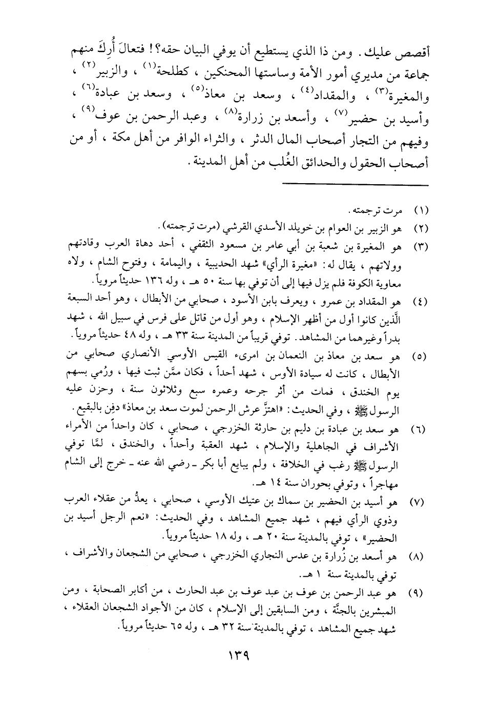 (9) هو عبد الرحمن بن عوف بن عبد عوف بن عبد الحارث، من أكابر الصحابة، ومن المبشرين بالجنّة، ومن السابقين إلى الإسلام، كان من الأجواد الشجعان العقلاء، شهد جميع المشاهد، توفي بالمدينة سنة 32 هـ، وله 65 حديثا مرويا.