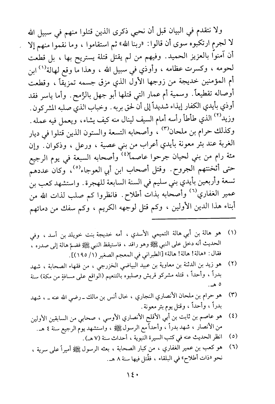 وكذلك حرام بن ملحان «3» ، وأصحابه التسعة والستون الذين قتلوا في ديار الغربة عند بئر معونة بأيدي أعراب من بني عصية، ورعل، وذكوان. وإن مئة رام من بني لحيان جرحوا عاصما «4» وأصحابه السبعة في يوم الرجيع حتى أثخنتهم الجروح. وقتل أصحاب ابن أبي العوجاء «5» ، وكان عددهم تسعة وأربعين بأيدي بني سليم في السنة السابعة للهجرة. واستشهد كعب بن عمير الغفاري «6» وأصحابه بذات أطلاح. فانظروا كم صلب لذات الله من أبناء هذا الدين الأولين، وكم قتل لوجهه الكريم، وكم سفك من دمائهم